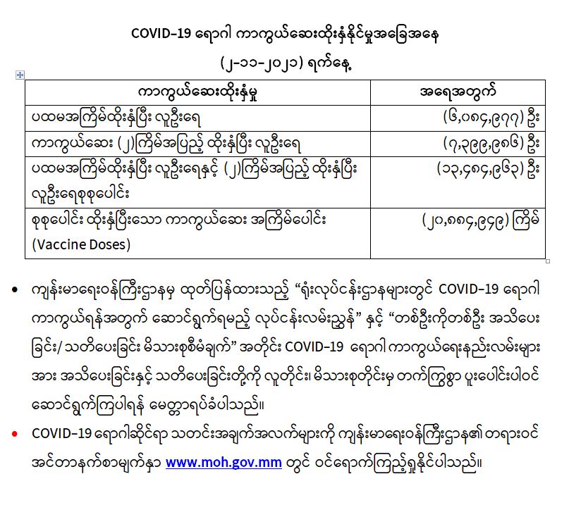 COVID-19 ရောဂါ ကာကွယ်ထိန်းချုပ်ရေးအတွက် တိုင်းဒေသကြီး/ပြည်နယ်များတွင် COVID-19 ရောဂါကာကွယ်ဆေးကို ဦးတည်အုပ်စုများသတ်မှတ်၍ ထိုးနှံပေးလျက်ရှိရာ (၂-၁၁-၂၀၂၁) ရက်နေ့အထိ လူဦးရေ စုစုပေါင်း (၁၃,၄၈၄,၉၆၃) ဦးအား ထိုးနှံပေးပြီးဖြစ်၍ ကာကွယ်ဆေး နှစ်ကြိမ် အပြည့် ထိုးနှံပြီးစီးသူ (၇,၃၉၉,၉၈၆) ဦးနှင့် ပထမအကြိမ်ထိုးနှံပြီးစီးသူ (6,084,977) ဦး ရှိပြီဖြစ်ပါသည်။ သို့ဖြစ်ပါ၍ (၂-၁၁-၂၀၂၁) ရက်နေ့အထိ မြန်မာနိုင်ငံတွင် COVID-19 ရောဂါ ကာကွယ် ဆေးအကြိမ်ရေ စုစုပေါင်း (၂၀,၈၈၄,၉၄၉) ကြိမ် ထိုးနှံပြီး ဖြစ်ပါသည်။