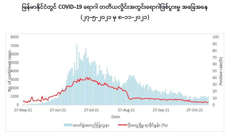 COVID-19 သံသယလူနာများ၊ ဓာတ်ခွဲအတည်ပြုလူနာနှင့် အနီးကပ်ထိတွေ့ခဲ့သူများနှင့်အသွား အလာကန့်သတ်ထားရှိသူများအား COVID-19 ရောဂါ ရှိ၊ မရှိ ဓာတ်ခွဲစမ်းသပ်စစ်ဆေးခြင်းအား ပုံမှန် ဆောင်ရွက်လျက်ရှိရာ (၈-၁၁-၂၀၂၁) ရက်နေ့၊ ည (၈:၀၀) နာရီမှ (၉-၁၁-၂၀၂၁) ရက်နေ့၊ ည (၈:၀၀) နာရီအတွင်း ဓာတ်ခွဲနမူနာစုစုပေါင်း (၂၄,၇၈၁) ခု အား စစ်ဆေးပြီးစီးခဲ့ရာ COVID-19 ရောဂါ ဓာတ်ခွဲအတည်ပြုလူနာသစ် (၇၇၆) ဦး တွေ့ရှိရပါသည်။ ထို့ကြောင့် ယနေ့အတွက် ရောဂါပိုး တွေ့ရှိမှု ရာခိုင်နှုန်းမှာ (၃.၁၃) ရာခိုင်နှုန်း ရှိပါသည်။