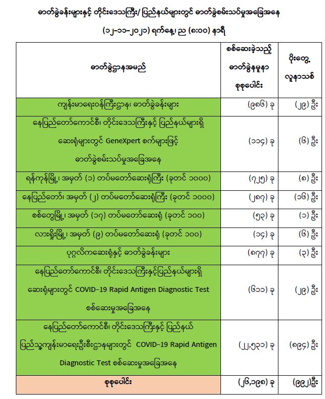 သို့ဖြစ်ပါ၍ ယနေ့အထိ ဓာတ်ခွဲနမူနာစုစုပေါင်း (၅,၁၆၁,၂၉၅)ခုအား စစ်ဆေးခဲ့ပြီး COVID-19 ဓာတ်ခွဲ အတည်ပြုလူနာ စုစုပေါင်း (၅၁၁,၇၁၇) ဦး ရှိပြီ ဖြစ်ပါသည်။