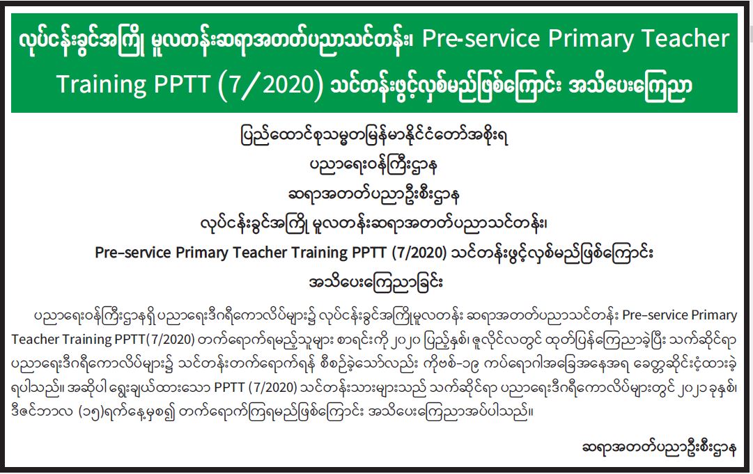 လုပ်ငန်းခွင်အကြို မူလတန်းဆရာအတတ်ပညာသင်တန်း၊ Pre-service Primary Teacher Training PPTT (7/2020) သင်တန်းဖွင့်လှစ်မည်ဖြစ်ကြောင်း အသိပေးကြေညာ 11/13/2021