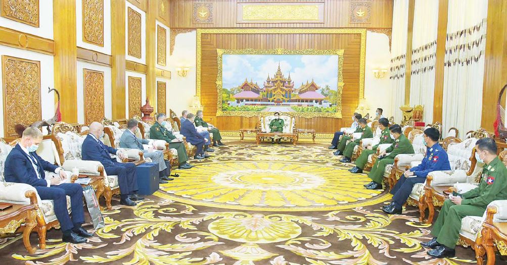 နိုင်ငံတော်စီမံအုပ်ချုပ်ရေးကောင်စီဥက္ကဋ္ဌ၊ တပ်မတော်ကာကွယ်ရေးဦးစီးချုပ် ဗိုလ်ချုပ်မှူးကြီး မင်းအောင်လှိုင်သည် ရုရှား-မြန်မာ စစ်ဘက်နည်းပညာ ပူးပေါင်း ဆောင်ရွက်ရေးပူးတွဲ ကော်မရှင်ဥက္ကဋ္ဌ၊ FSMTC of Russia ၏ ဒုတိယညွှန်ကြားရေးမှူး Mr.Vladimir Drozhzhov နှင့် JSC “Rosoboronexport” ကုမ္ပဏီ ဒုတိယညွှန်ကြား ရေးမှူးချုပ် Mr.A.L.Chekmarev တို့ ဦးဆောင်သည့် ကိုယ်စားလှယ်အဖွဲ့အား ယနေ့မွန်းလွဲပိုင်းတွင် နေပြည်တော်ရှိ ဘုရင့်နောင်ရိပ်သာ ဧည့်ခန်းမဆောင်၌ လက်ခံတွေ့ဆုံသည်။