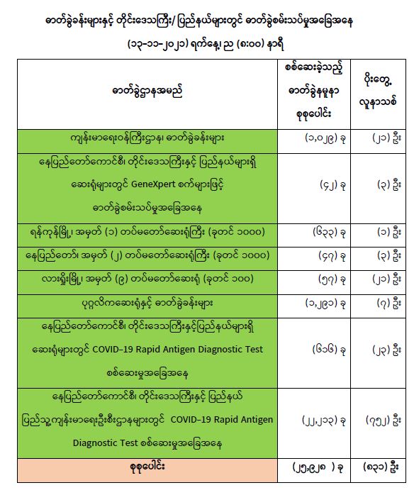 သို့ဖြစ်ပါ၍ ယနေ့အထိ ဓာတ်ခွဲနမူနာစုစုပေါင်း (၅,၁၈၇,၂၂၃)ခုအား စစ်ဆေးခဲ့ပြီး COVID-19 ဓာတ်ခွဲ အတည်ပြုလူနာ စုစုပေါင်း (၅၁၂,၅၄၈) ဦး ရှိပြီ ဖြစ်ပါသည်။