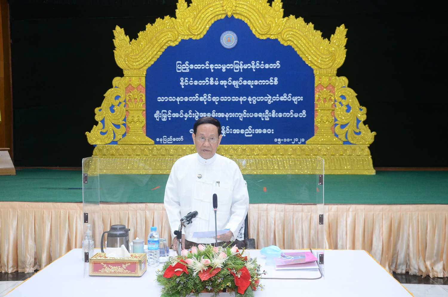 အစည်းအဝေးတွင် သာသနာတော်ဆိုင်ရာ သာသနာနုဂ္ဂဟဘွဲ့တံဆိပ်များ ချီးမြှင့် အပ်နှင်းပွဲ အခမ်းအနား ကျင်းပရေး ဦးစီးကော်မတီဥက္ကဋ္ဌ သာသနာရေးနှင့်ယဉ်ကျေးမှု ဝန်ကြီးဌာန၊ ပြည်ထောင်စုဝန်ကြီးက နှစ်စဉ်ကျင်းပမြဲဖြစ်သည့် သာသနာတော်ဆိုင်ရာ ဘွဲ့တံဆိပ်တော်များ ဆက်ကပ်လှူဒါန်းပွဲ အခမ်းအနားကို မတ် ၂၇ ရက်(တပေါင်းလပြည့်နေ့)တွင် ဘွဲ့တံဆိပ်တော်ရ ဆရာတော်ကြီးများနှင့် သာသနာနွယ်ဝင် သီလရှင်များကို ကိုဗစ်-၁၉ ကာကွယ် တားဆီးရေးဆိုင်ရာ သတ်မှတ် စည်းကမ်းများနှင့်အညီ နိုင်ငံတော်အဆင့် ခမ်းနားထည်ဝါစွာ ကျင်းပနိုင်ခဲ့သကဲ့သို့ တိုင်းဒေသကြီး/ပြည်နယ်အဆင့်တို့တွင်လည်း တစ်ချိန်တည်း တစ်ပြိုင်တည်း အောင်မြင်စွာ ကျင်းပနိုင်ခဲ့ပြီး သာသနာတော်ဆိုင်ရာ သာသနာနုဂ္ဂဟဘွဲ့ တံဆိပ်ရ လူပုဂ္ဂိုလ် ၁၂၄ ဦးတို့ကို သာသနာ နုဂ္ဂဟဘွဲ့တံဆိပ် ချီးမြှင့်ခြင်းကို ကိုဗစ်-၁၉ ရောဂါဖြစ်ပွားမှု များပြားနေသည့်အတွက် ခေတ္တ ဆိုင်းငံ့ ထားခဲ့ရကြောင်း။