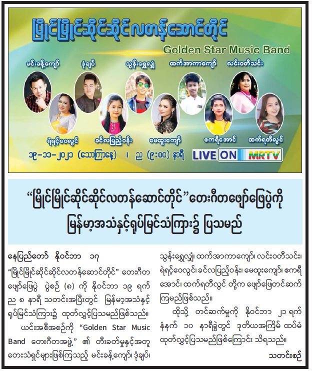မြိုင်မြိုင်ဆိုင်ဆိုင်လတန်ဆောင်တိုင် တေးဂီတဖျော်ဖြေပွဲကို မြန်မာ့အသံနှင့်ရုပ်မြင်သံကြား၌ ပြသမည် 11/18/2021