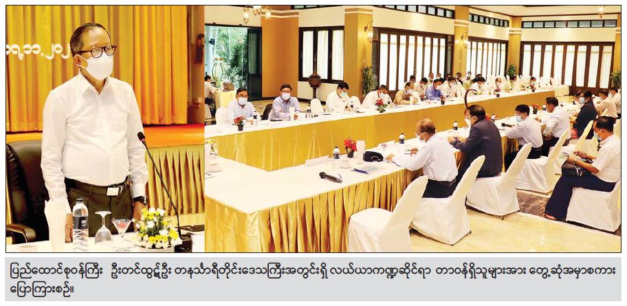 တွေ့ဆုံစဉ် ပြည်ထောင်စုဝန်ကြီးက မြန်မာနိုင်ငံ ရေထွက်ပစ္စည်းများ၏ ပြည်ပပို့ကုန် ၃၀ ရာခိုင်နှုန်းကို တနင်္သာရီတိုင်းဒေသကြီး ရေလုပ်ငန်းကဏ္ဍက ဖြည့်ဆည်းပေးလျက်ရှိရာ ယင်း လုပ်ငန်းများ ပိုမိုဖွံ့ဖြိုးတိုးတက်ရေးနှင့် တိုးချဲ့ဆောင်ရွက်နိုင် ရေးအတွက် ဘက်စုံထောင့်စုံမှ ကြိုးပမ်းလျက်ရှိကြောင်း၊ ဒေသနေပြည်သူများအနေဖြင့် လုပ်ခလစာရရှိသော လုပ်ငန်းများတွင် အခစားများ အဖြစ် လုပ်ကိုင်နေမှု သာမက ကိုယ်ပိုင်လုပ်ငန်းများ စွန့်ဦးတီထွင် လုပ်ကိုင်လိုပါက ရေလုပ်ငန်း မွေးမြူရေးလုပ်ငန်းနှင့် စိုက်ပျိုးရေး လုပ်ငန်းများ ထူထောင် လုပ်ကိုင်နိုင်ရေးမှာ အဓိကကျသဖြင့် မိမိတို့ဝန်ကြီးဌာနက အားပေးကူညီလျက် ရှိပါကြောင်း။