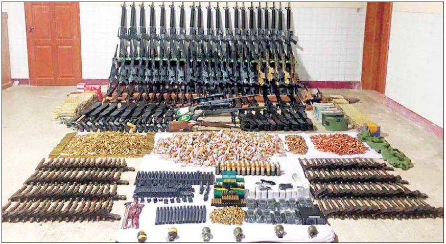 - ထို့ပြင် သင်္ဃန်းကျွန်းမြို့နယ်၊ (၂၉)ရပ်ကွက်၊ သုခိတာလမ်း၊ အမှတ်(၆၇)အား ဝင်ရောက် ရှာဖွေခဲ့ရာ M-16 ၇ လက်၊ AK-47 ၈ လက်၊ MK-12 ၁၅ လက်၊ M4 A1 ကာဘိုင် ၃ လက်၊ FCG-9 ၃ လက်၊ စနိုက်ပါ ၂ လက်၊ ကာဘိုင် ၁ လက်၊ ပစ္စတို ၁၁ လက်၊ လက်လုပ်ပစ္စတို ၁၂၈ လက်၊ M-16 ကျည်အိမ် ၅၀ ခု၊ AK-47 ကျည်အိမ် ၁၄ ခု၊ MK-12 ကျည်အိမ် ၃၀ ခု၊ FCG-9 ကျည်အိမ် ၆ ခု၊ ပစ္စတိုကျည်အိမ် ၃၀ ခု၊ ၅.၅၆ ကျည် ၃၈၅၀ တောင့်၊ ၇.၆၂ ကျည် ၂၅၀ တောင့်၊ ပစ္စတိုကျည် ၆၁၀ တောင့်၊ 12 Volt ကျည် ၂၇၀၀ တောင့်၊ ပွိုင့် ၄၅ ကျည် ၁၅၀ တောင့်၊ AK-47 ကျည် ၁၀၀၀ တောင့်၊ ၄၀ မမ ဗုံးသီး ၂၆ လုံး၊ ရှေ့ထွက်မိုင်း ၆ လုံး၊ MK-12 သေနတ် ဆက်စပ်ပစ္စည်းအစုံ ၃၀ ၊ လက်ပစ်ဗုံး ၁၈ လုံး၊ ကြိုးဆွဲလက်ပစ်ဗုံး ၁၅ လုံး၊ လက်လုပ်ဗုံး ၁၃၈ လုံး၊ လက်လုပ်ဗုံး(အကြီး) ၃ လုံး၊ မီးရှို့လက်လုပ်ဗုံး၊ ၃၉ လုံး၊ ယမ်းပြင်း ၂၅ ထုပ်၊ လက်လုပ်ယမ်း ၄၃ ထုပ်၊ ယမ်းကြိုး(၁၀၀ ပေ) ၁ ခွေ၊ ဒီတိုနေတာ ၈၀၀ ချောင်း၊ TNT ယမ်း (၀.၂၅)ပေါင် ၁၅၃ တောင့်၊ TNT ယမ်း(၁ ပေါင်) ၁၀ တောင့်၊ C4 ယမ်း (၁.၂၅)ပေါင် ၉ တောင့်၊ Transistor ၁၄ ဗူး၊ ဖုန်း(ကီးပတ်) ၁၆ လုံး၊ နာရီ ၇ လုံး၊ ဂြိုလ်တုဖုန်း ၁၂ လုံးနှင့် ဆက်သွယ်ရေး အထိုင်စက် ၁ လုံး၊ ၂.၅ လက်မသံ ၅ ပိဿာ(စုစုပေါင်း လက်နက်မျိုးစုံ ၅၀ လက်၊ လက်လုပ်ပစ္စတို ၁၂၈ လက်၊ ကျည်အိမ်မျိုးစုံ ၁၃၀ ခု၊ ကျည်မျိုးစုံ ၈၅၆၀ တောင့်၊ ၄၀ မမဗုံးသီး ၂၆ လုံး၊ ရှေ့ထွက်မိုင်း ၆ လုံး၊ လက်ပစ်ဗုံးမျိုးစုံ ၃၃ လုံး၊ လက်လုပ်မိုင်းမျိုးစုံ ၁၈၀ လုံး၊ TNT ယမ်းမျိုးစုံ ၁၆၃ တောင့်၊ C4 ယမ်း ၉ တောင့်၊ ဒီတိုနေတာ ၈၀၀ ချောင်း၊ ဂြိုလ်တုဖုန်း ၁၂ လုံးနှင့် ဖောက်ခွဲရေး ဆက်စပ်ပစ္စည်း) တို့အား သိမ်းဆည်းရမိခဲ့သည်။