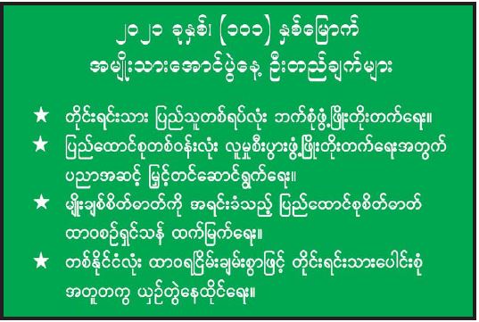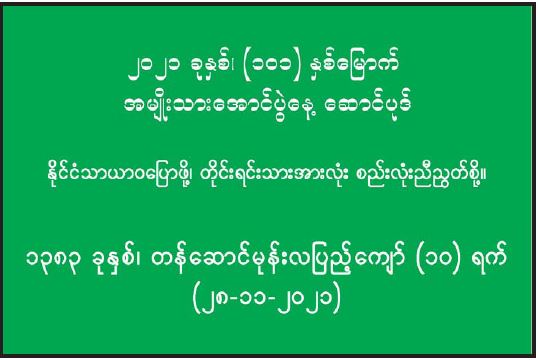၂၀၂၁ ခုနှစ် (၁၀၁) နှစ်မြောက် အမျိုးသားအောင်ပွဲနေ့ ဆောင်ပုဒ်နှင့် ဦးတည်ချက်များ 11/22/2021 ၂၀၂၁ ခုနှစ် (၁၀၁) နှစ်မြောက် အမျိုးသားအောင်ပွဲနေ့ ဆောင်ပုဒ်နှင့် ဦးတည်ချက်များ