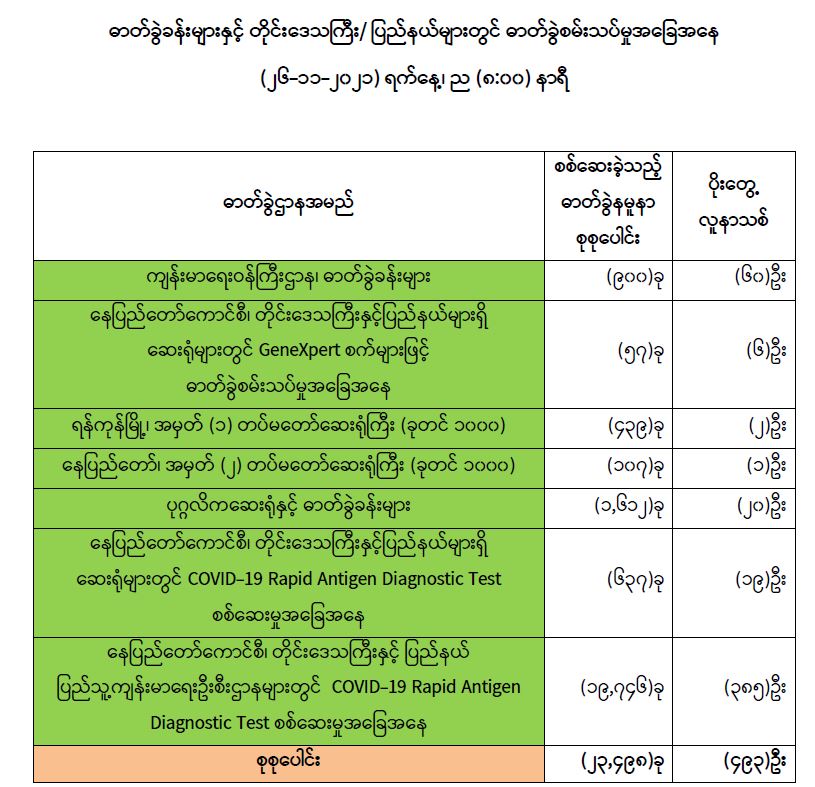 သို့ဖြစ်ပါ၍ ယနေ့အထိ ဓာတ်ခွဲနမူနာစုစုပေါင်း (၅,၄၉၈,၅၄၉) ခုအား စစ်ဆေးခဲ့ပြီး COVID-19 ဓာတ်ခွဲ အတည်ပြုလူနာ စုစုပေါင်း (၅၂၀,၇၀၆) ဦး ရှိပြီ ဖြစ်ပါသည်။