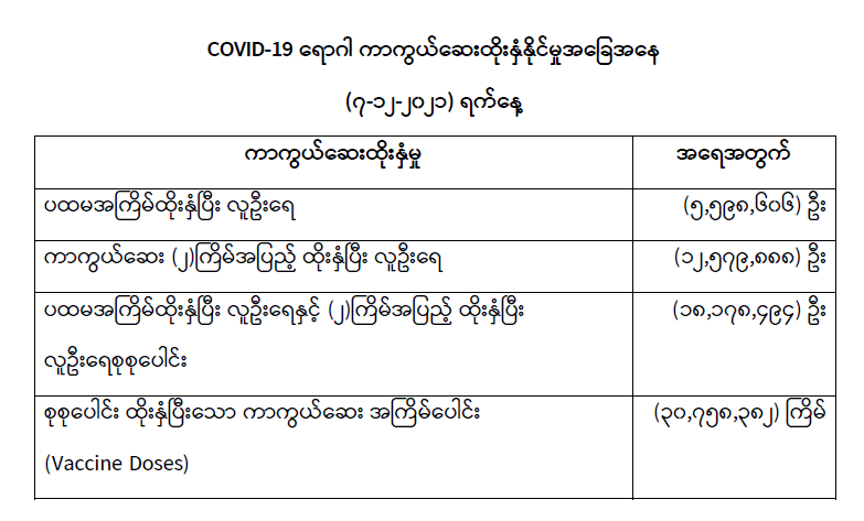 COVID-19 ရောဂါ ကာကွယ်ထိန်းချုပ်ရေးအတွက် တိုင်းဒေသကြီး/ပြည်နယ်များတွင် COVID-19 ရောဂါကာကွယ်ဆေးကို ဦးတည်အုပ်စုများ သတ်မှတ်၍ ထိုးနှံပေးလျက်ရှိရာ (၇-၁၂-၂၀၂၁) ရက်နေ့ အထိ လူဦးရေ စုစုပေါင်း (၁၈,၁၇၈,၄၉၄) ဦးအား ထိုးနှံပေးပြီးဖြစ်၍ ကာကွယ်ဆေးနှစ်ကြိမ်အပြည့် ထိုးနှံပြီးစီးသူ (၁၂,၅၇၉,၈၈၈) ဦး နှင့် ပထမအကြိမ်ထိုးနှံပြီးစီးသူ (၅,၅၉၈,၆၀၆) ဦး ရှိပြီ ဖြစ်ပါသည်။ သို့ဖြစ်ပါ၍ (၇-၁၂-၂၀၂၁) ရက်နေ့အထိ မြန်မာနိုင်ငံတွင် COVID-19 ရောဂါကာကွယ်ဆေး အကြိမ်ရေ စုစုပေါင်း (၃၀,၇၅၈,၃၈၂) ကြိမ် ထိုးနှံပြီး ဖြစ်ပါသည်။