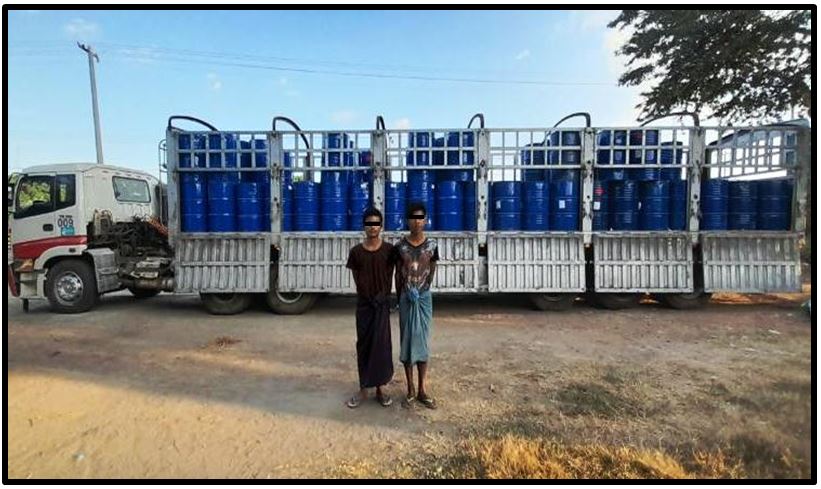 ဖြစ်စဉ်မှာ မူးယစ်ဆေးဝါးတားဆီးနှိမ်နင်းရေးရဲတပ်ဖွဲ့မှ တပ်ဖွဲ့ဝင်များပါဝင်သော ပူးပေါင်း အဖွဲ့ သည် ဒီဇင်ဘာ ၁၁ ရက် ညနေ ၃ နာရီခွဲတွင် သာစည်မြို့နယ်၊ မိတ္ထီလာ-တောင်ကြီးသွား ကားလမ်း၊ ကျွဲတပ်ဆုံကျေးရွာအနီး မိုင်တိုင်အမှတ်(၃၁/၄)တွင် မိတ္ထီလာမှ တောင်ကြီးဘက်သို့ ထွန်းလင်းနောင် (ခ)နောင်နောင် (၂၄)နှစ် မောင်းနှင်ပြီး ဇော်မျိုးဦး(၂၂)နှစ် လိုက်ပါလာသည့် ၂၂ ဘီး တွဲကား မော်တော်ယာဉ်အား သတင်းအရရှာဖွေရာ ဒေသကာလတန်ဖိုးငွေကျပ်သိန်း ၁,၆၀၀ ကျော် တန်ဖိုးရှိ ထိန်းချုပ်ဓာတုပစ္စည်း Toluene ၇,၅၀၀ လီတာ၊ Acetone ၃,၀၀၀ လီတာနှင့် Ethylacetate ၇,၅၀၀ လီတာ တို့အား သိမ်းဆည်းရမိခဲ့ပြီး စစ်ဆေးဖော်ထုတ်ချက်များအရ သိမ်းဆည်းရမိ ထိန်းချုပ် ဓာတု ပစ္စည်းများအား ရန်ကုန်တိုင်းဒေသကြီးမှ ရှမ်းပြည်နယ်(တောင်ပိုင်း)သို့ သယ်ဆောင်ခြင်းဖြစ် ကြောင်း သိရှိရသဖြင့် ၎င်းတို့အား ဥပဒေအရ အရေးယူထားရှိပြီး ကွင်းဆက်ပြစ်မှုကျူးလွန် သူများအား ဆက်လက်စစ်ဆေးဖော်ထုတ်လျက်ရှိကြောင်း သိရသည်။
