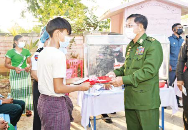 ထို့နောက် နိုင်ငံတော်စီမံအုပ်ချုပ်ရေး ကောင်စီဥက္ကဋ္ဌ နိုင်ငံတော်ဝန်ကြီးချုပ်က နိုင်ငံသားစိစစ်ရေးကတ်များ ပြုလုပ်ပြီးစီးသူများကို နိုင်ငံသားစိစစ်ရေးကတ်ပြားများ ပေးအပ်ပြီး ရင်းရင်းနှီးနှီးနှုတ်ဆက်စကား ပြောကြားကာ ဝန်ထမ်းများအတွက် ချီးမြှင့်ငွေများ ပေးအပ်သည်။