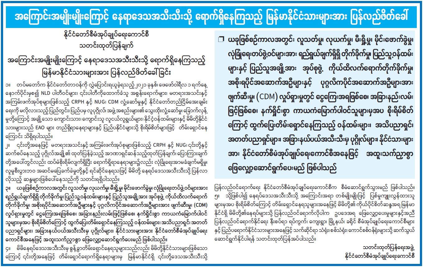အကြောင်းအမျိုးမျိုးကြောင့် နေရာဒေသအသီးသီးသို့ ရောက်ရှိနေကြသည့် မြန်မာနိုင်ငံသားများအား ပြန်လည်ဖိတ်ခေါ် 12/17/2021