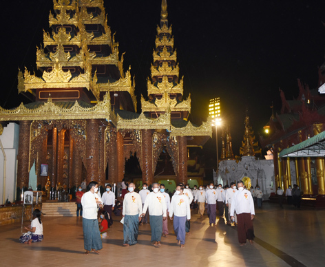 ထို့နောက် ပြည်ထောင်စုဝန်ကြီးများနှင့် တာဝန်ရှိသူများသည် လေးဆူဓာတ်ပုံ ရွှေတိဂုံစေတီတော် မြတ်ကြီးအား လျှပ်စစ်မီးအဆင့်မြှင့် ထွန်းညှိထားမှုကို လှည့်လည်ဖူးမျှော် ကြည်ညိုကြသည်။