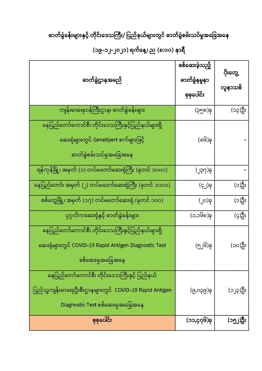 သို့ဖြစ်ပါ၍ ယနေ့အထိ ဓာတ်ခွဲနမူနာစုစုပေါင်း (၅,၈၉၇,၈၇၀) ခုအား စစ်ဆေးခဲ့ပြီး COVID-19 ဓာတ်ခွဲအတည်ပြုလူနာ စုစုပေါင်း (၅၂၈,၂၅၃) ဦး ရှိပြီ ဖြစ်ပါသည်။