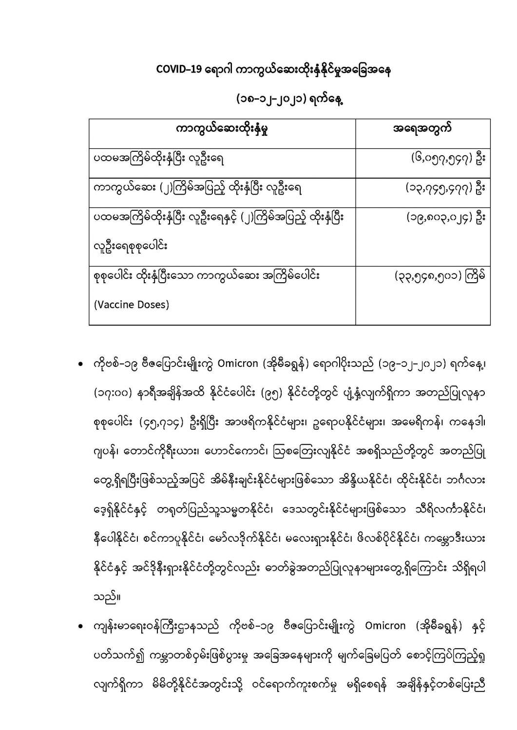 COVID-19 ရောဂါ ကာကွယ်ထိန်းချုပ်ရေးအတွက် တိုင်းဒေသကြီး/ပြည်နယ်များတွင် COVID-19 ရောဂါကာကွယ်ဆေးကို ဦးတည်အုပ်စုများသတ်မှတ်၍ ထိုးနှံပေးလျက်ရှိရာ (၁၈-၁၂-၂၀၂၁) ရက်နေ့ အထိ လူဦးရေ စုစုပေါင်း (၁၉,၈၀၃,၀၂၄) ဦးအား ထိုးနှံပေးပြီးဖြစ်၍ ကာကွယ်ဆေး နှစ်ကြိမ်အပြည့် ထိုးနှံပြီးစီးသူ (၁၃,၇၄၅,၄၇၇) ဦး နှင့် ပထမအကြိမ်ထိုးနှံပြီးစီးသူ (၆,၀၅၇,၅၄၇) ဦး ရှိပြီ ဖြစ်ပါ သည်။ သို့ဖြစ်ပါ၍ (၁၈-၁၂-၂၀၂၁) ရက်နေ့အထိ မြန်မာနိုင်ငံတွင် COVID-19 ရောဂါကာကွယ် ဆေးအကြိမ်ရေ စုစုပေါင်း (၃၃,၅၄၈,၅၀၁) ကြိမ် ထိုးနှံပြီး ဖြစ်ပါသည်။