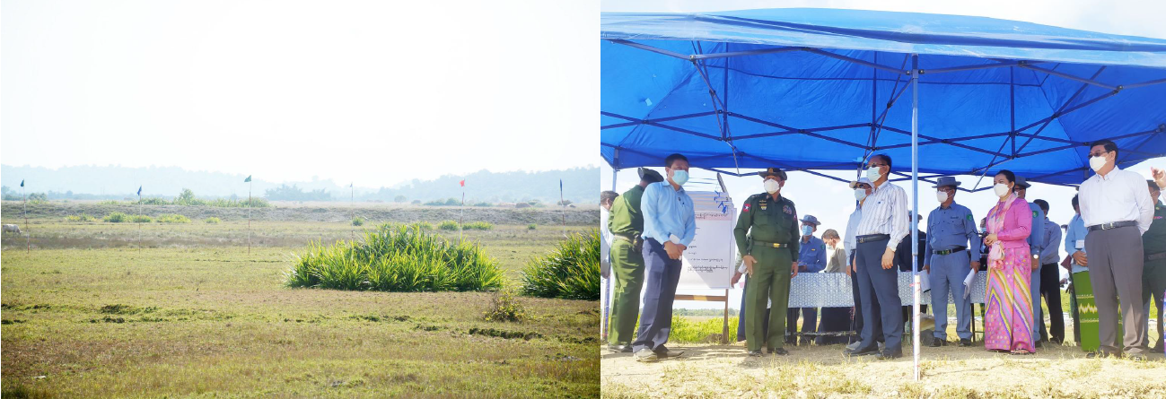 ပြည်ထောင်စုဝန်ကြီးများနှင့်အဖွဲ့သည် ဒီဇင်ဘာ ၂၁ ရက် နံနက်ပိုင်းတွင် သံတွဲမြို့ အမျိုးသမီးအိမ်တွင်းမှု သက်မွေးလုပ်ငန်းပညာသင်တန်း ကျောင်းတည်ဆောက်မည့် မြေနေရာကို ကြည့်ရှုစစ်ဆေးသည်။