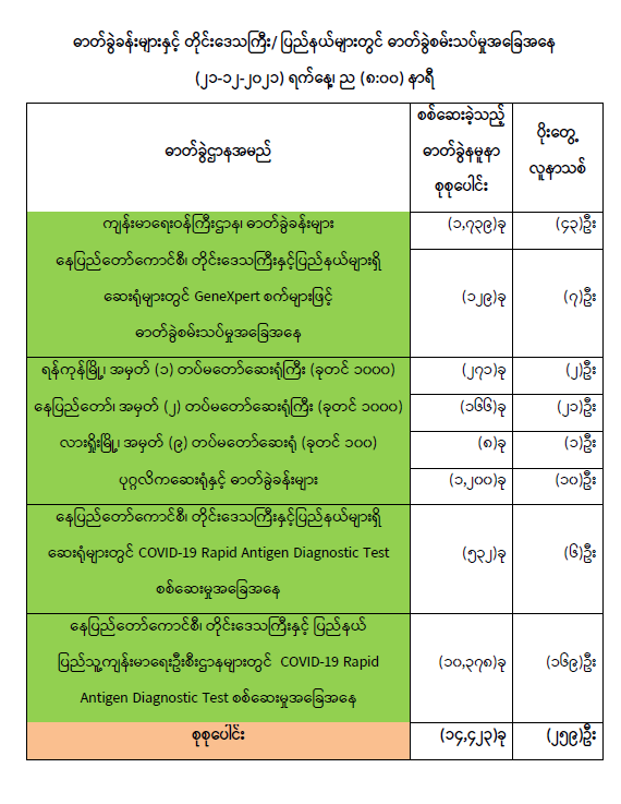 သို့ဖြစ်ပါ၍ ယနေ့အထိ ဓာတ်ခွဲနမူနာစုစုပေါင်း (၅,၉၂၃,၈၁၂) ခုအား စစ်ဆေးခဲ့ပြီး COVID-19 ဓာတ်ခွဲအတည်ပြုလူနာ စုစုပေါင်း (၅၂၈,၆၃၉) ဦး ရှိပြီ ဖြစ်ပါသည်။