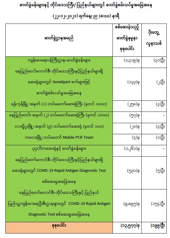 သို့ဖြစ်ပါ၍ ယနေ့အထိ ဓာတ်ခွဲနမူနာစုစုပေါင်း (၅,၉၃၇,၃၈၉) ခုအား စစ်ဆေးခဲ့ပြီး COVID-19 ဓာတ်ခွဲအတည်ပြုလူနာ စုစုပေါင်း (၅၂၈,၈၃၈) ဦးရှိပြီ ဖြစ်ပါသည်။