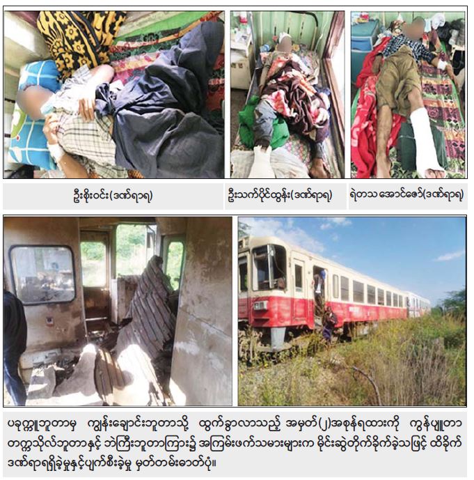 နိုင်ငံတော်တည်ငြိမ်အေးချမ်းမှုကို မလိုလားသည့် PDF အမည်ခံ အကြမ်းဖက်သမားများက ခရီးသည်တင်မီးရထားတစ်စင်း မိုင်းဆွဲတိုက်ခိုက်ခြင်းနှင့် လမ်းပန်းဆက်သွယ်ရေး ပြတ်တောက်စေရန်အတွက် မီးရထားသံလမ်းများပေါ်၌ မိုင်းထောင်ဖောက်ခွဲခြင်းပြုလုပ်