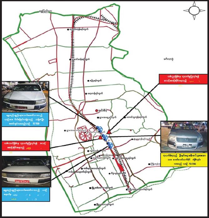 ရွှေထည်ပစ္စည်းများသယ်ဆောင်လာသည့်ယာဉ်အား လုယက်ရန် တာဝန်ခွဲဝေခဲ့ရာ သန့်ဇင်ဦး(ခ)ဝတုတ် မောင်းနှင်သည့်ယာဉ်သည် ၎င်းယာဉ်၏ ရှေ့မှ ပိတ်ဆို့ရပ်တန့်စေပြီး သန်းမြင့်စိုး(ခ)စိုးလေးနှင့် ဖမ်းဆီးရန်ကျန် ဇော်လင်းတို့ ၂ ဦး လိုက်ပါသည့်ယာဉ်သည် ရွှေများသယ်ဆောင်လာသည့် ဦးနှင်းငွေ မောင်းနှင်သောယာဉ်၏ နောက်မှလိုက်ပါစေကာ အခြေအနေ စောင့်ကြည့်ရန်နှင့် စည်သူဖြိုး(ခ) စည်သူထွေးနှင့် ဖမ်းဆီးရန်ကျန် မှတ်ကြီး၊ ချိုဦး တို့ ၃ ဦးသည် အင်းစိန်မြို့နယ်၊ လှိုင်မြစ်လမ်း၊ အင်းစိန်ခုံးကျော်တံတားအနီးရှိ လမ်းဘယ်ဘက်ခြမ်းတွင် လည်းကောင်း၊ ဖမ်းဆီးရန်ကျန် နေဇော် နှင့် ကုလား တို့ ၂ ဦးသည် လမ်းညာဘက်ခြမ်းတွင် လည်းကောင်း အသင့်ကြိုတင်စောင့်ဆိုင်းကာ ဗဟိုလမ်းဘက်သို့ ချိုးကွေ့သည့် တံတား အလယ်နေရာတွင် လုယက်ရန် ဆောင်ရွက်ခဲ့ကြောင်း။