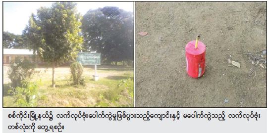 ထိုသို့ လုပ်ဆောင်လျက်ရှိရာ စစ်ကိုင်းတိုင်းဒေသကြီး၊ စစ်ကိုင်းမြို့နယ်၊ ပေါက္ကားကျေးရွာရှိ အခြေခံပညာ မူလတန်းလွန်ကျောင်းသို့ ဒီဇင်ဘာ ၂၉ ရက်နံနက် ၁၀ နာရီ ၃၅ မိနစ်ခန့်တွင် အကြမ်းဖက်သူ အမျိုးသား ၃ ဦးက ဆိုင်ကယ် ၁ စီးဖြင့် ရောက်ရှိလာပြီး လက်လုပ်ဗုံး ၂ လုံးဖြင့် ပစ်ပေါက်ထွက်ပြေးသွားခဲ့သဖြင့် လက်လုပ်ဗုံး ၁ လုံးမှာ ကျောင်းဝင်းအတွင်း ကျရောက် ပေါက်ကွဲခဲ့ပြီး ကျန် ၁ လုံးမှာ ပေါက်ကွဲခြင်း မရှိခဲ့သဖြင့် လုံခြုံရေးတပ်ဖွဲ့ဝင်များက သက်မဲ့ပြုလုပ် ရှင်းလင်းခဲ့ကြောင်းနှင့် အဆောက်အဦနှင့် လူထိခိုက် ဒဏ်ရာရရှိမှုမရှိကြောင်း သိရှိရသည်။