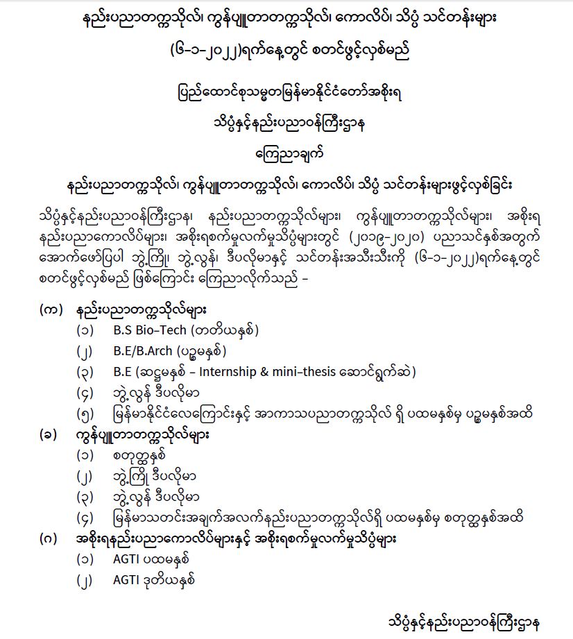 နည်းပညာတက္ကသိုလ်၊ ကွန်ပျူတာတက္ကသိုလ်၊ ကောလိပ်၊ သိပ္ပံ သင်တန်းများ (၆-၁-၂၀၂၂)ရက်နေ့တွင် စတင်ဖွင့်လှစ်မည်