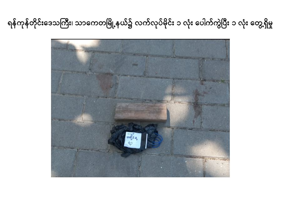 ထိုသို့လုပ်ဆောင်လျက်ရှိရာ ဇန်နဝါရီ ၁ ရက် မွန်းလွဲ ၁၂ နာရီ ၁၀ မိနစ်ခန့်တွင် ရန်ကုန် တိုင်းဒေသကြီး၊ သာကေတမြို့နယ်၊ (၇/အရှေ့) ရပ်ကွက်ရှိ အမှတ်(၇)အခြေခံပညာ မူလတန်း ကျောင်းအနီး လက်လုပ်မိုင်းများဖြင့် မိုင်းထောင်ဖောက်ခွဲခဲ့သည်။ ထိုသို့ ဖောက်ခွဲမှုကြောင့် ခြံစည်းရိုးအနီး ပေါက်ကွဲမှု ဖြစ်ပွားခဲ့သဖြင့် အဆိုပါနေရာအား လုံခြုံရေးတပ်ဖွဲ့ဝင်များက သွာရောက်စစ်ဆေးခဲ့ရာ လက်လုပ်မိုင်း ပေါက်ကွဲထားသည့် PVC ပိုက်အပိုင်းအစများ တွေ့ရှိရပြီး ပေါက်ကွဲမှုဖြစ်ပွားသည့် နေရာနှင့် ပေ ၂၀ ခန့်အကွာတွင် PVC ပိုက် တစ်ခု နှင့် ကီးပက်ဖုန်း ၁ လုံးတို့အား ဝါယာကြိုးဖြင့် ချိတ်ဆက်ပြုလုပ်ထားသည့် လက်လုပ်မိုင်း တစ်လုံးအား ထပ်မံတွေ့ရှိရသဖြင့် သက်မဲ့ပြုလုပ် သိမ်းဆည်းခဲ့ကြောင်း သိရသည်။
