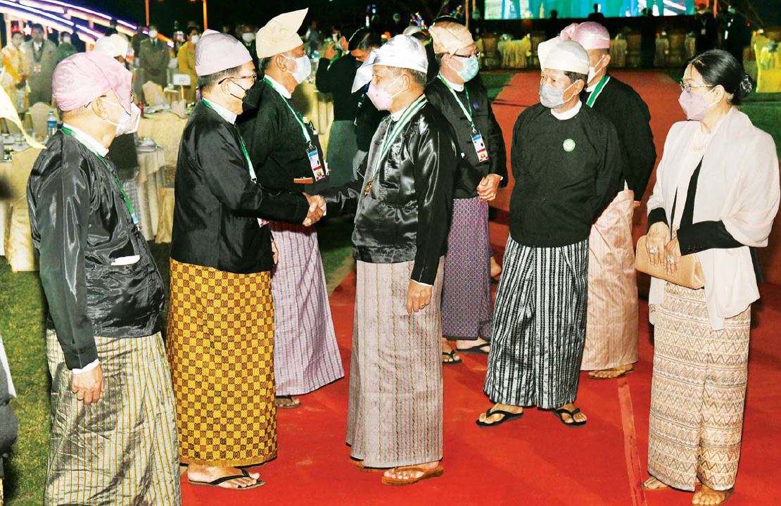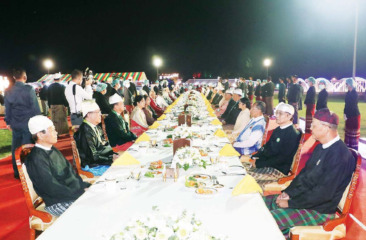 ယင်းနောက် နိုင်ငံတော်စီမံအုပ်ချုပ်ရေးကောင်စီဥက္ကဋ္ဌ နိုင်ငံတော်ဝန်ကြီးချုပ် ဗိုလ်ချုပ်မှူးကြီး မင်းအောင်လှိုင်နှင့် ဇနီးဒေါ်ကြူကြူလှတို့သည် ညစာစားပွဲအခမ်းအနား ကျင်းပရာနေရာသို့ ရောက် ရှိကြရာ နိုင်ငံတော်စီမံအုပ်ချုပ်ရေးကောင်စီ ဒုတိယဥက္ကဋ္ဌ၊ ဒုတိယဝန်ကြီးချုပ် ဒုတိယ ဗိုလ်ချုပ်မှူးကြီး စိုးဝင်းနှင့်ဇနီး ဒေါ်သန်းသန်းနွယ်၊ ပြည်ထောင်စုဝန်ကြီးများနှင့်ဇနီးများက ကြိုဆိုနှုတ်ဆက်ကြပြီး ၎င်းတို့နှင့်အတူ ဥပစာမြက်ခင်းပြင်သို့ရောက်ရှိပြီး နိုင်ငံရေးပါတီများမှ ဥက္ကဋ္ဌများနှင့် ကိုယ်စားလှယ်များ အား ရင်းရင်းနှီးနှီးလိုက်လံနှုတ်ဆက်သည်။