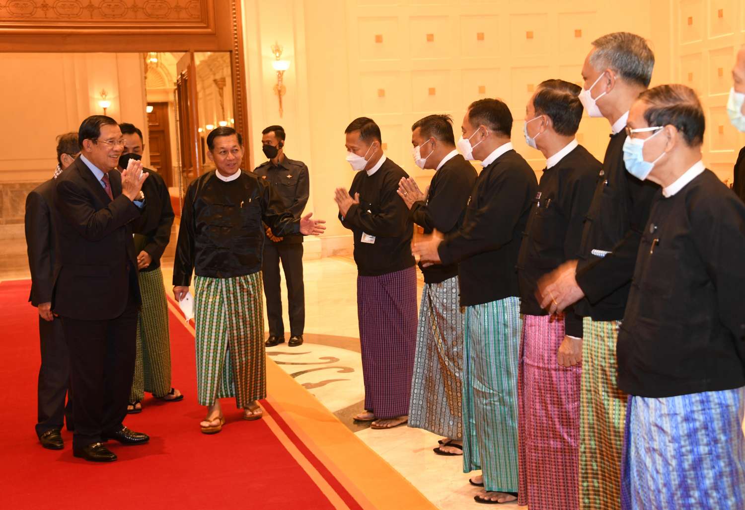ဦးစွာ နိုင်ငံတော်စီမံအုပ်ချုပ်ရေးကောင်စီဥက္ကဋ္ဌ နိုင်ငံတော်ဝန်ကြီးချုပ်က ကမ္ဘောဒီးယား နိုင်ငံဝန်ကြီးချုပ်အား ကြိုဆိုနှုတ်ဆက်ပြီး ညစာစားပွဲ အခမ်းအနားသို့ တက်ရောက်လာကြသည့် နိုင်ငံတော်စီမံအုပ်ချုပ်ရေး ကောင်စီဒုတိယဥက္ကဋ္ဌ ဒုတိယဝန်ကြီးချုပ်၊ ကောင်စီတွဲဖက် အတွင်းရေးမှူး၊ ပြည်ထောင်စုဝန်ကြီးများနှင့် မိတ်ဆက်ပေးသည်။