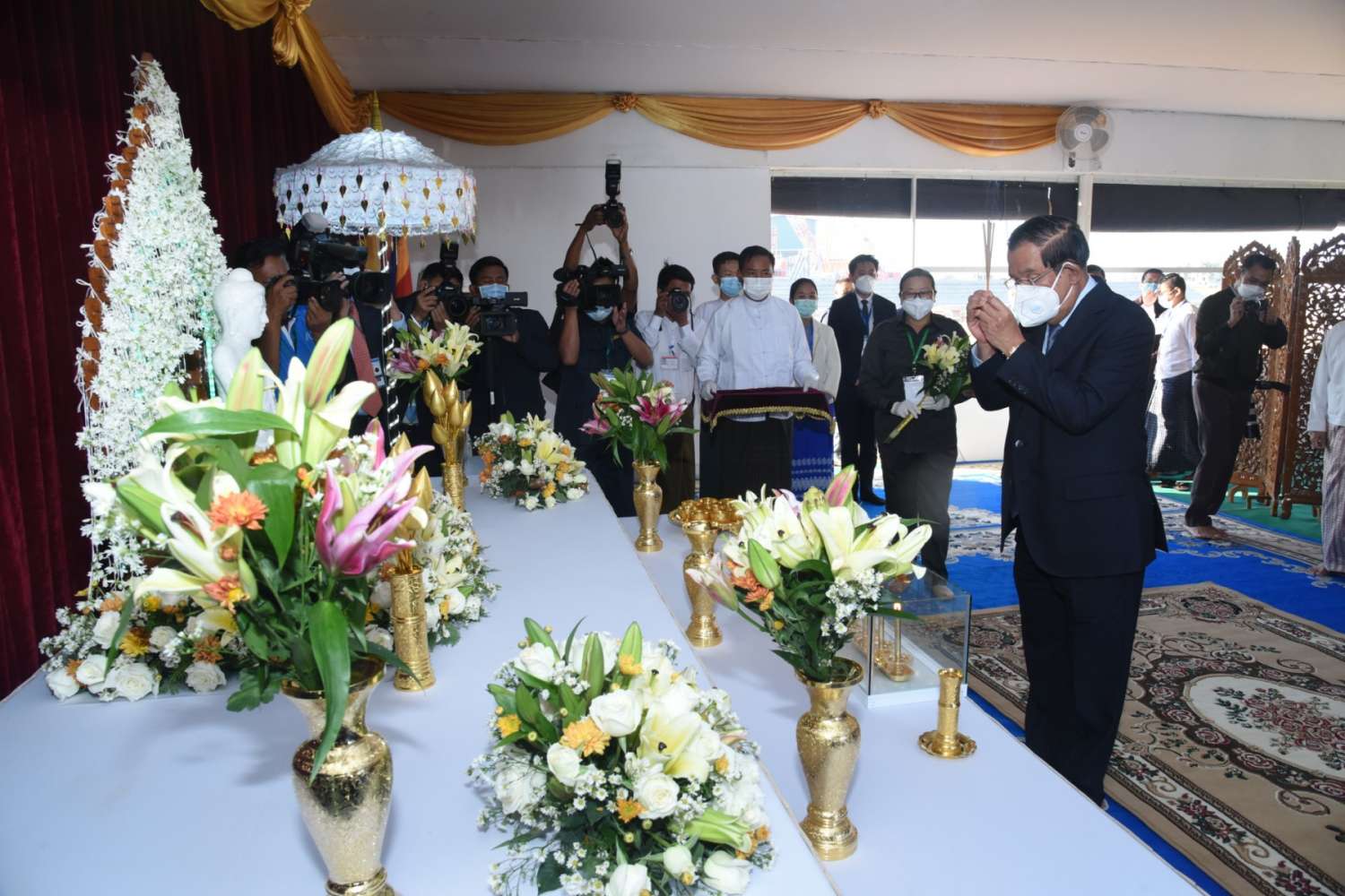 ဦးစွာ ကမ္ဘောဒီးယားဝန်ကြီးချုပ်အား သာသနာရေးဝန်ကြီးဌာန ပြည်ထောင်စုဝန်ကြီး ဦးကိုကို၊ ကာကွယ်ရေးဦးစီးချုပ်ရုံး(ကြည်း)မှ ဒုတိယဗိုလ်ချုပ်ကြီး ညို စော၊ ဒုတိယ ဗိုလ်ချုပ်ကြီး ကံမြင့်သန်းနှင့် တာဝန်ရှိသူများက ကြိုဆိုနှုတ်ဆက်ကြသည်။