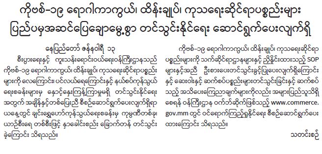 ကိုဗစ် − ၁၉ ရောဂါ ကာကွယ်၊ ထိန်းချုပ်၊ ကုသရေးဆိုင်ရာပစ္စည်းများ ပြည်ပမှ အဆင်ပြေချောမွေ့စွာ တင်သွင်းနိုင်ရေး ဆောင်ရွက်ပေးလျက်ရှိ 01/14/2022