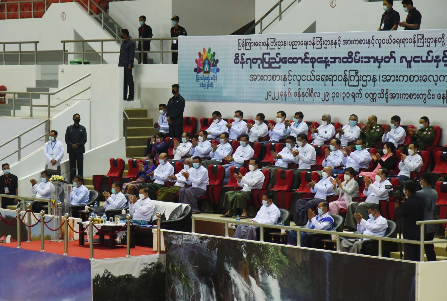 (၃၁)ကြိမ်မြောက် အရှေ့တောင်အာရှ အားကစားပြိုင်ပွဲသို့ ဝင်ရောက်ယှဉ်ပြိုင်ရန် စခန်းသွင်းလေ့ကျင့်လျက် ရှိသည့် မြန်မာ့လက်ရွေးစင်အားကစားများ၏ လေ့ကျင့် သရုပ်ပြသမှုအား ယနေ့နံနက်ပိုင်းတွင် နေပြည်တော်ရှိ ဝဏ္ဏသိဒ္ဓိအားကစားရုံ (B) ရုံ၌ ကျင်းပပြုလုပ်ရာ နိုင်ငံတော်စီမံအုပ်ချုပ်ရေးကောင်စီဥက္ကဋ္ဌ နိုင်ငံတော်ဝန်ကြီးချုပ် ဗိုလ်ချုပ်မှူးကြီး မင်းအောင်လှိုင် တက်ရောက်ကြည့်ရှုအားပေးသည်။