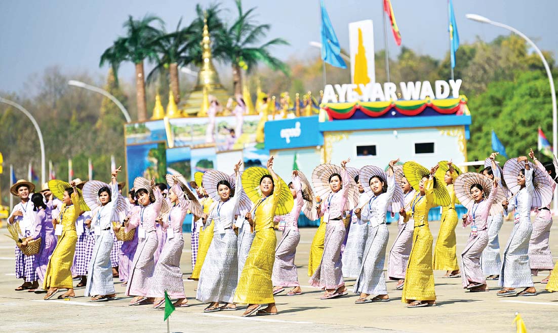 ထို့နောက် မြန်မာနိုင်ငံအတွင်းရှိ တိုင်းရင်းသားများ၏ အထိမ်းအမှတ်များ၊ လူနေမှုစရိုက်များ၊ ဓလေ့ထုံးတမ်းအစဉ်အလာများနှင့် ထုတ်ကုန်များ ကို သရုပ်ဖော်ပြသထားသည့် နေပြည်တော် ကောင်စီနယ်မြေကိုယ်စားပြု ဂုဏ်ပြုယာဉ်များနှင့်အတူ ဂုဏ်ပြုအကအဖွဲ့က “ပြည်ထောင်စုသွေး” သီချင်းဖြင့်လည်းကောင်း၊ ကချင်ပြည်နယ် ကိုယ်စားပြု ဂုဏ်ပြု ယာဉ်များနှင့်အတူ ဂုဏ်ပြုအကအဖွဲ့က “မမေ့နိုင်တဲ့မြေ” သီချင်းဖြင့်လည်းကောင်း၊ ကယားပြည်နယ် ကိုယ်စားပြု ဂုဏ်ပြုယာဉ်များနှင့်အတူ ဂုဏ်ပြုအကအဖွဲ့က “ဖားစည်သံ” သီချင်းဖြင့်လည်းကောင်း၊ ကရင်ပြည်နယ်ကိုယ်စားပြု ဂုဏ်ပြုယာဉ်များနှင့်အတူ ဂုဏ်ပြုအက အဖွဲ့က “အောဟု - အောဟောင်” သီချင်းဖြင့် လည်းကောင်း၊ ချင်းပြည်နယ်ကိုယ်စားပြု ဂုဏ်ပြုယာဉ်များနှင့်အတူ ဂုဏ်ပြုအကအဖွဲ့က “ပျော်ရွှင်ဖွယ်နေ့ရက်များဆီသို့” သီချင်းဖြင့် လည်းကောင်း၊ စစ်ကိုင်းတိုင်းဒေသကြီး ကိုယ်စားပြုဂုဏ်ပြုယာဉ်များနှင့်အတူ ဂုဏ်ပြုအက အဖွဲ့က “အောင်လံ တဝေဝေ ရွှေစစ်ကိုင်းဌာနေ” သီချင်းဖြင့်လည်းကောင်း၊ တနင်္သာရီ တိုင်းဒေသကြီး ကိုယ်စားပြု ဂုဏ်ပြုယာဉ်များနှင့်အတူ ဂုဏ်ပြုအကအဖွဲ့က “တိုးတက်ဝေစည် တနင်္သာရီ” သီချင်းဖြင့်လည်းကောင်း၊ ပဲခူးတိုင်းဒေသကြီးကိုယ်စားပြု ဂုဏ်ပြုယာဉ်များနှင့်အတူ ဂုဏ်ပြုအကအဖွဲ့က “ပဲခူးဟုခေါ်သည်” သီချင်းဖြင့်လည်းကောင်း၊ မကွေးတိုင်း ဒေသကြီး ကိုယ်စားပြုဂုဏ်ပြုယာဉ်များနှင့်အတူ ဂုဏ်ပြုအကအဖွဲ့က “လှသော အညာမြေ” သီချင်းဖြင့်လည်းကောင်း၊ မန္တလေးတိုင်းဒေသကြီး ကိုယ်စားပြု ဂုဏ်ပြုယာဉ်များနှင့် အတူဂုဏ်ပြုအကအဖွဲ့က “လှမ်းခဲ့ပေါ့မန္တလာမြေ” သီချင်းဖြင့်လည်းကောင်း၊ မွန်ပြည်နယ် ကိုယ်စားပြု ဂုဏ်ပြုယာဉ်များနှင့်အတူ ဂုဏ်ပြုအကအဖွဲ့က “တွဲလက်ညီညီ ရှေ့သို့ချီ” သီချင်းဖြင့်လည်းကောင်း၊ ရခိုင်ပြည်နယ် ကိုယ်စားပြု ဂုဏ်ပြုယာဉ်များနှင့်အတူ ဂုဏ်ပြုအက အဖွဲ့က “နာဝရူပဗျာလ”သီချင်းဖြင့် လည်းကောင်း၊ ရန်ကုန်တိုင်းဒေသကြီး ကိုယ်စားပြု ဂုဏ်ပြုယာဉ်များနှင့်အတူ ဂုဏ်ပြုအကအဖွဲ့က “ပြည်ထောင်စုသွေးသား ဗမာဟေ့ဗမာ”သီချင်းဖြင့်လည်းကောင်း၊ ရှမ်းပြည်နယ်ကိုယ်စားပြု ဂုဏ်ပြုယာဉ်များနှင့်အတူ ဂုဏ်ပြုအက အဖွဲ့က “နောင်အင်းလေး” သီချင်းဖြင့်လည်းကောင်း၊ ဧရာဝတီတိုင်းဒေသကြီး ကိုယ်စားပြု ဂုဏ်ပြုယာဉ်များနှင့်အတူ ဂုဏ်ပြုအကအဖွဲ့က “မမပုသိမ်သူ” သီချင်းဖြင့်လည်းကောင်း၊ နေပြည်တော်ကောင်စီ ကိုယ်စားပြု ပြည်ထောင်စုယာဉ်နှင့်အတူ ဂုဏ်ပြုအကအဖွဲ့က “ဦးရွှေရိုးနှင့် ဒေါ်မိုး” အကဖြင့်လည်းကောင်း ဂုဏ်ပြုအလှပြ ကပြဖျော်ဖြေ တင်ဆက်ကြပြီး တပ်မတော်လေမှ ဒုတိယဗိုလ်မှူးကြီး ကျော်အောင် ဦးဆောင်သည့် ရာဇာအုပ်