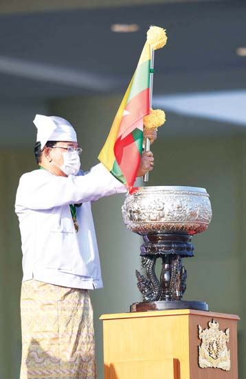 ထို့နောက် နေပြည်တော်ကောင်စီဥက္ကဋ္ဌ ဒေါက်တာမောင်မောင်နိုင်က “ပြည်ထောင်စု အလံတော်” ကို တစ်နှစ်တာ ရပ်နားမည့် နေပြည်တော် မြို့တော်ခန်းမသို့ တပ်မတော် (ကြည်း၊ ရေ၊ လေ)၊ မြန်မာနိုင်ငံရဲတပ်ဖွဲ့၊ အလံစောင့်အဖွဲ့နှင့် တိုင်းရင်းသား တိုင်းရင်းသူများ ခြံရံ၍ ပြည်ထောင်စု လှေဖြင့် ပြန်လည်သယ်ဆောင်ကြသည်။
