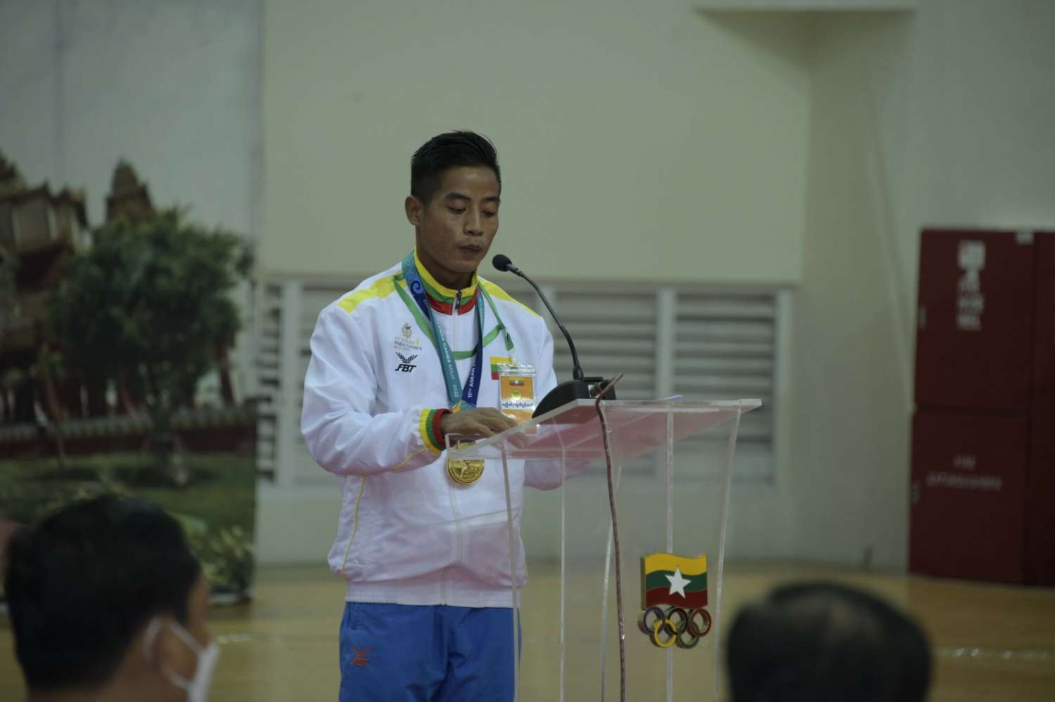 ယင်းနောက် နိုင်ငံ့ဂုဏ်ဆောင် ဆုတံဆိပ်ရ အားကစားသမားများ ကိုယ်စား ပြေးခုန်ပစ်အားကစားနည်းမှ ရွှေတံဆိပ် ၂ ခုနှင့်ငွေတံဆိပ် ၁ ခု ရရှိခဲ့သည့် အားကစား သမား ဒုတပ်ကြပ် စိုးပေက ကျေးဇူးတင်ပြန်လည်စကားပြောကြားရာ၌ ယခုပြိုင်ပွဲတွင် အောင်မြင်မှုများဆွတ်ခူးနိုင်စေရန် မြန်မာနိုင်ငံမသန်စွမ်းသူများ အားကစားအဖွဲ့ချုပ်မှ တာဝန်ရှိသူများနှင့် အုပ်ချုပ်သူ/နည်းပြများ၏ သွန်သင်ဆုံးမမှုများဖြင့် လေ့ကျင့်မှုများကို စဉ်ဆက်မပြတ် လုပ်ဆောင်ခဲ့ပါကြောင်း၊ အဆိုပါရလဒ်များကြောင့် အခြားသောနိုင်ငံများမှ ပြိုင်ပွဲဝင်အားကစားသမားများနှင့်အတူ ယှဉ်ပြိုင်ရာတွင် ပြိုင်ဘက်အသင်းများကို အနိုင်ရရှိအောင် ကစားနိုင်ခဲ့ခြင်းဖြစ်ကြောင်း၊ အားကစားပြိုင်ပွဲတွင် ဆုရရှိခဲ့သည့် အားကစားသမားများကို ယခုကဲ့သို့ ထိုက်ထိုက်တန်တန် ဂုဏ်ပြုဆုချီးမြှင့်ပေးသည့် နိုင်ငံတော်ဝန်ကြီးချုပ်နှင့် တာဝန်ရှိသူများကို ဆုရရှိသည့် အားကစားသမားများကိုယ်စား ကျေးဇူးတင်ရှိပါကြောင်း၊ နောင်နှစ်များတွင်လည်း ကျင်းပမည့် မသန်စွမ်းအားကစား ပြိုင်ပွဲများတွင် မိမိတို့၏မသန်စွမ်းများသည် “မသန်လည်းလူ၊ သန်လည်းလူ၊ စွမ်းဆောင်နိုင်မှုသာအဓိက” ဆိုသည့်အချက်ကို သက်သေပြရင်း နိုင်ငံ့ကိုယ်စားပြုပြီး ယခုထက်ဆုတံဆိပ်များ ပိုမိုဆွတ်ခူးရရှိနိုင်အောင် ကြိုးစားယှဉ်ပြိုင်သွားမည်ဖြစ်ပါကြောင်း ပြောကြားသည်။