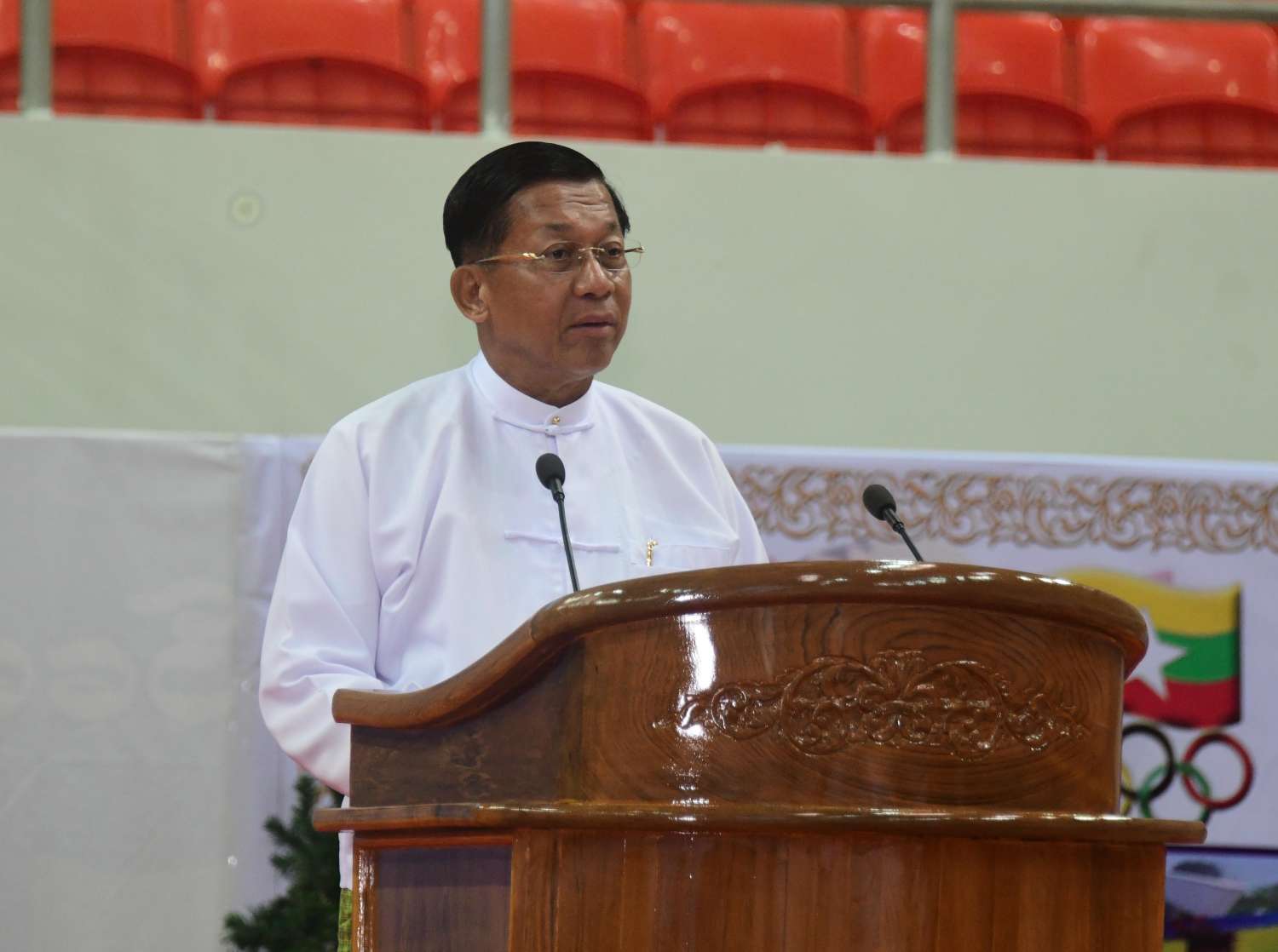 အင်ဒိုနီးရှားနိုင်ငံ၌ ကျင်းပသည့် (၁၁)ကြိမ်မြောက် အာဆီယံမသန်စွမ်းသူများ အားကစားပြိုင်ပွဲတွင် ဆုတံဆိပ်ရရှိခဲ့သော မြန်မာအားကစားအဖွဲ့များအား နိုင်ငံတော်က ဂုဏ်ပြုဆုချီးမြှင့်ခြင်းအခမ်းအနားကို ယနေ့မွန်းလွဲပိုင်းတွင် နေပြည်တော်ရှိ ဝဏ္ဏသိဒ္ဓိ အားကစားရုံ(B)၌ ကျင်းပရာ နိုင်ငံတော်စီမံအုပ်ချုပ်ရေးကောင်စီဥက္ကဋ္ဌ နိုင်ငံတော်ဝန်ကြီးချုပ် ဗိုလ်ချုပ်မှူးကြီးမင်းအောင်လှိုင် တက်ရောက်အမှာစကားပြောကြားပြီး ဂုဏ်ပြုဆုငွေများ ပေးအပ်ချီးမြှင့်သည်။