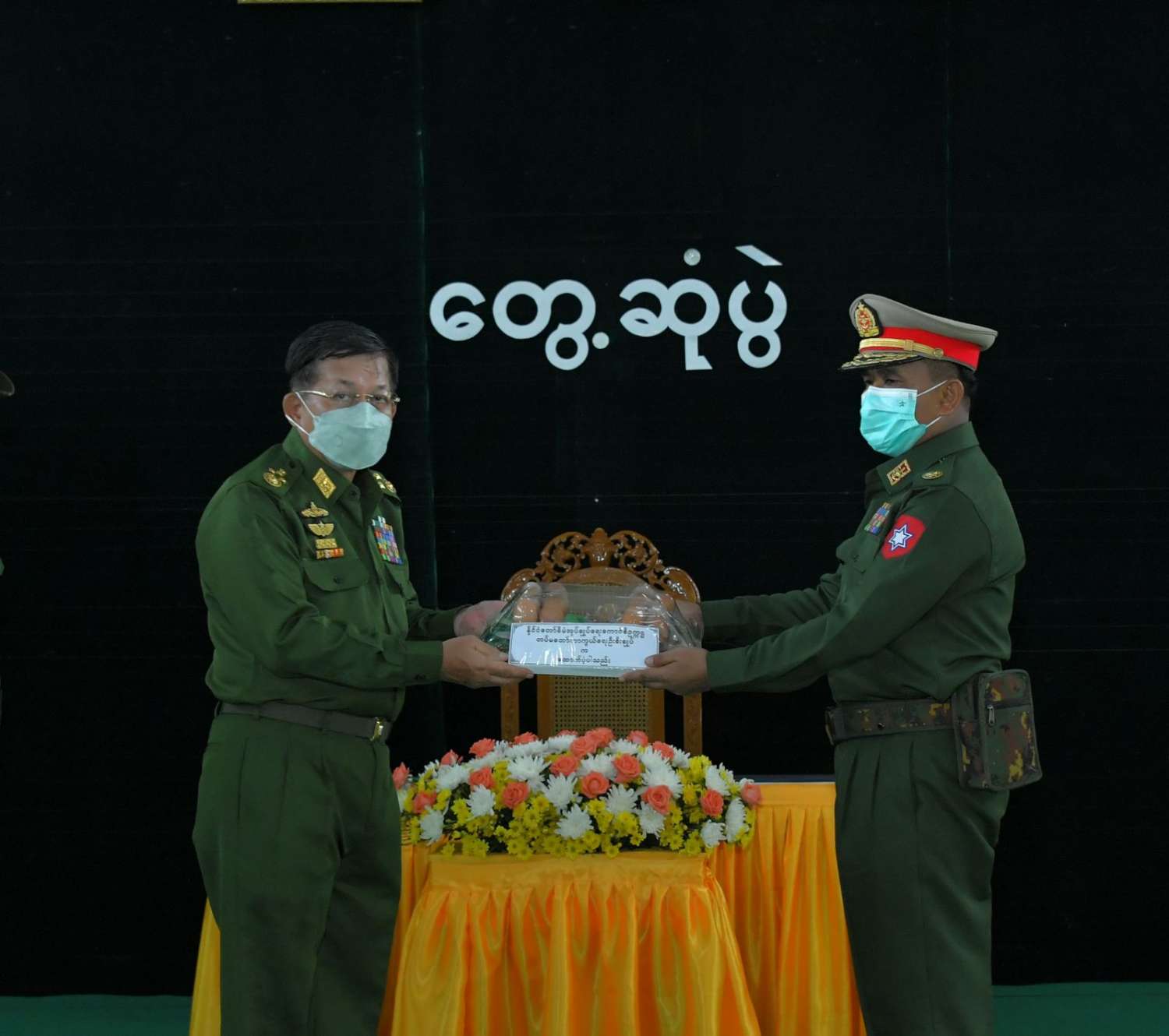 ထို့နောက် နိုင်ငံတော်စီမံအုပ်ချုပ်ရေးကောင်စီဥက္ကဋ္ဌ တပ်မတော်ကာကွယ်ရေးဦးစီးချုပ်က အရာရှိ၊ စစ်သည်၊ မိသားစုများအတွက် စားသောက်ဖွယ်ရာပစ္စည်းများကို ပေးအပ်ရာ ပြည်တပ်နယ်မှူးက လည်းကောင်း၊ နိုင်ငံတော်စီမံအုပ်ချုပ်ရေးကောင်စီဥက္ကဋ္ဌ တပ်မတော်ကာကွယ်ရေးဦးစီးချုပ်၏ ဇနီးက တပ်နယ်မိခင်နှင့် ကလေးစောင့်ရှောက်ရေးအသင်းအတွက် ချီးမြှင့်ငွေများကို ပေးအပ်ရာ ပြည်တပ်နယ်မှူး၏ ဇနီးကလည်းကောင်း အသီးသီး လက်ခံရယူကြသည်။ ယင်းနောက် ညှိနှိုင်းကွပ်ကဲရေးမှူး (ကြည်း၊ ရေ၊ လေ) ဗိုလ်ချုပ်ကြီး မောင်မောင်အေးက တပ်နယ်မှ အရာရှိ၊ စစ်သည်၊ မိသားစုများအတွက် သုတရသ စာအုပ်စာစောင်များကိုပေးအပ်ရာ ပန်းတောင်းတပ်နယ်မှူးက လက်ခံရယူသည်။