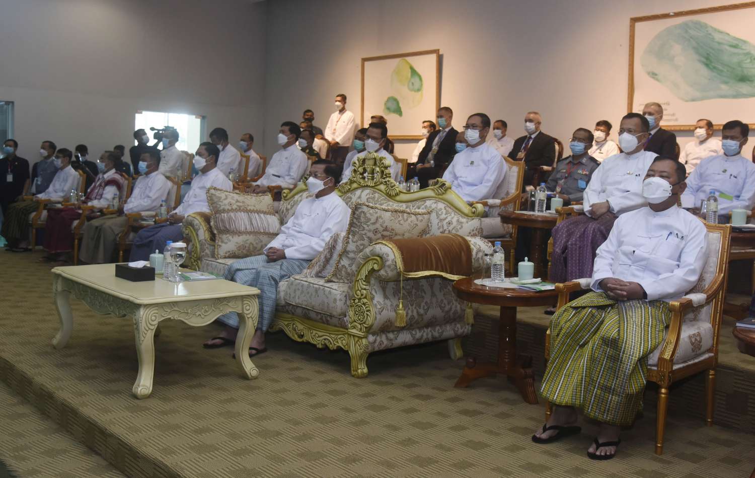 ဦးစွာ နိုင်ငံတော် စီမံအုပ်ချုပ်ရေးကောင်စီ ဥက္ကဋ္ဌ နိုင်ငံတော် ဝန်ကြီးချုပ်နှင့် အခမ်းအနား တက်ရောက်လာကြသူများသည် ရတနာပစ္စည်းများ ထုတ်လုပ်မှု အဆင့်ဆင့်နှင့် ၂၀၂၂ ခုနှစ်၊ နှစ်လယ် မြန်မာ့ကျောက်မျက်ရတနာပြပွဲ အခမ်းအနား ကျင်းပနိုင်ရေး ပြင်ဆင် ဆောင်ရွက်ခဲ့မှု ဗီဒီယိုမှတ်တမ်းအား ကြည့်ရှုကြသည်။