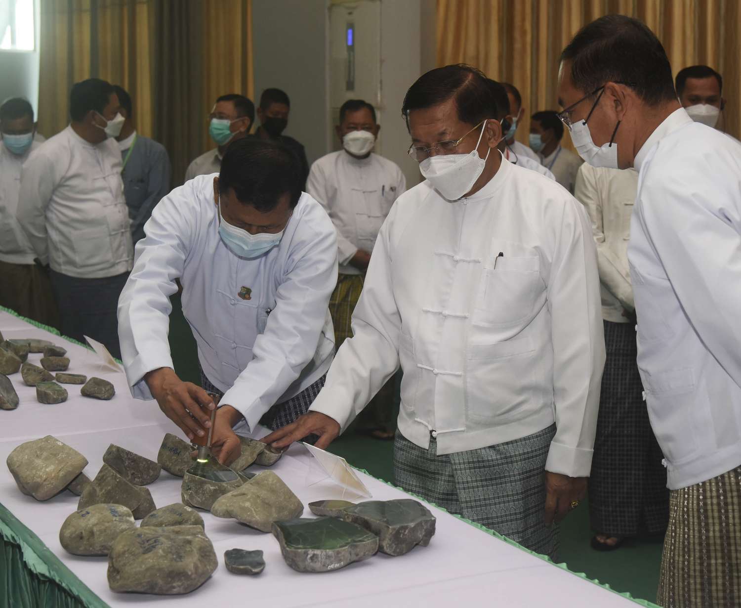 ယင်းနောက် နိုင်ငံတော် စီမံအုပ်ချုပ်ရေးကောင်စီ ဥက္ကဋ္ဌ နိုင်ငံတော် ဝန်ကြီးချုပ်နှင့် အခမ်းအနား တက်ရောက်လာကြသူများသည် ၂၀၂၂ ခုနှစ်၊ နှစ်လယ် မြန်မာ့ကျောက်မျက်ရတနာပြပွဲ၌ ရောင်းချရန် မဏိရတနာ ကျောက်စိမ်းခန်းမအတွင်း ပြသထားသော ကျောက်စိမ်း၊ ကျောက်မျက်အတွဲများနှင့် ပုလဲအတွဲများ၊ ခန်းမအပြင်ဘက်တွင် ခင်းကျင်းပြသထားသည့် ကျောက်စိမ်းရိုင်း အတွဲများကို လိုက်လံကြည့်ရှုစစ်ဆေးပြီး တာဝန်ရှိသူများက ရှင်းလင်း တင်ပြမှုအပေါ် နိုင်ငံတော် စီမံအုပ်ချုပ်ရေးကောင်စီ ဥက္ကဋ္ဌ နိုင်ငံတော် ဝန်ကြီးချုပ်က လိုအပ်သည်များ လမ်းညွှန်မှာကြားသည်။