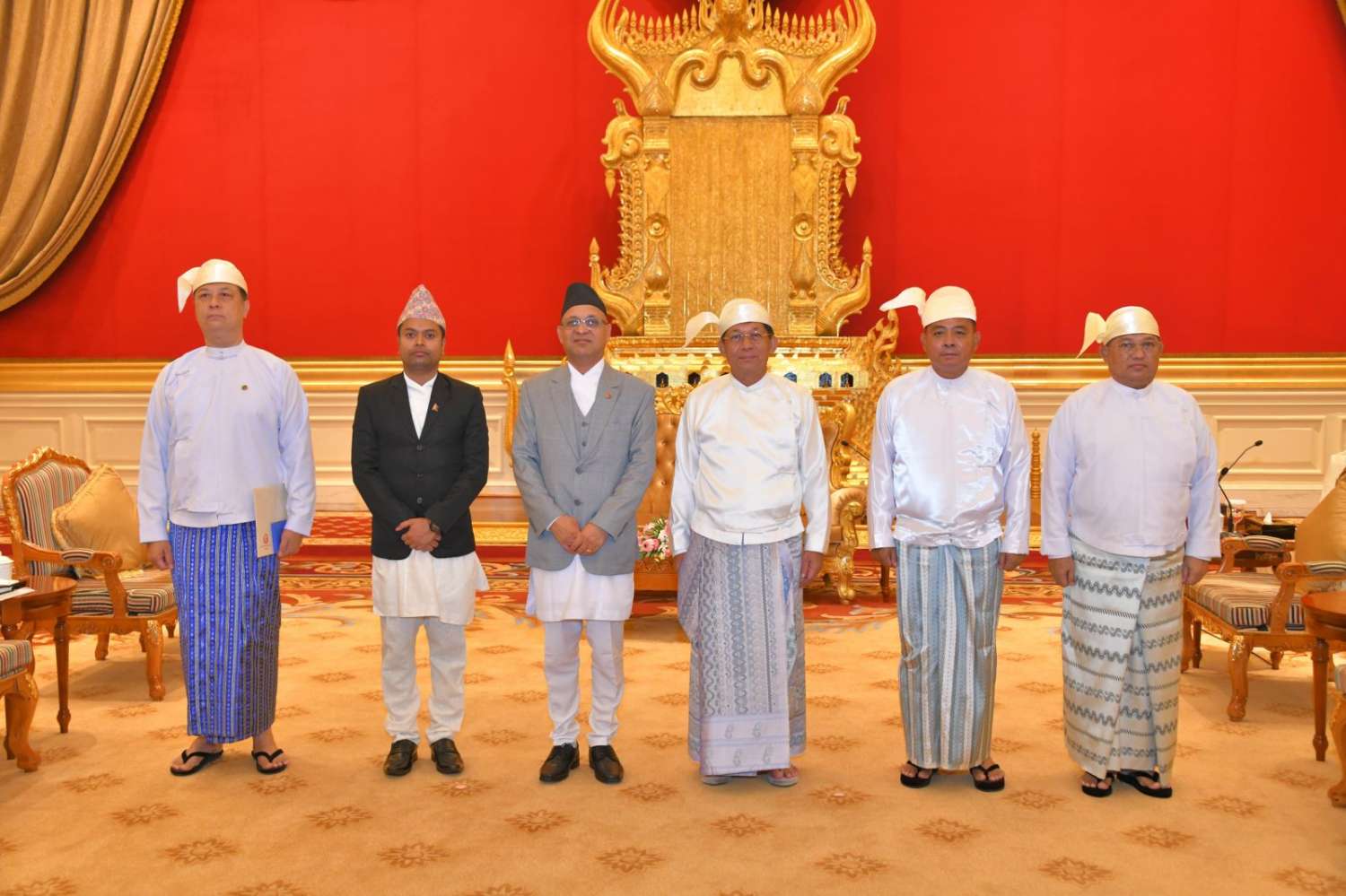တွေ့ဆုံပွဲအပြီးတွင် နိုင်ငံတော်စီမံအုပ်ချုပ်ရေးကောင်စီဥက္ကဋ္ဌ နိုင်ငံတော်ဝန်ကြီးချုပ်နှင့် မြန်မာနိုင်ငံဆိုင်ရာ နီပေါနိုင်ငံသံအမတ်ကြီးတို့သည် စုပေါင်းမှတ်တမ်းတင် ဓာတ်ပုံရိုက်ကြသည်။