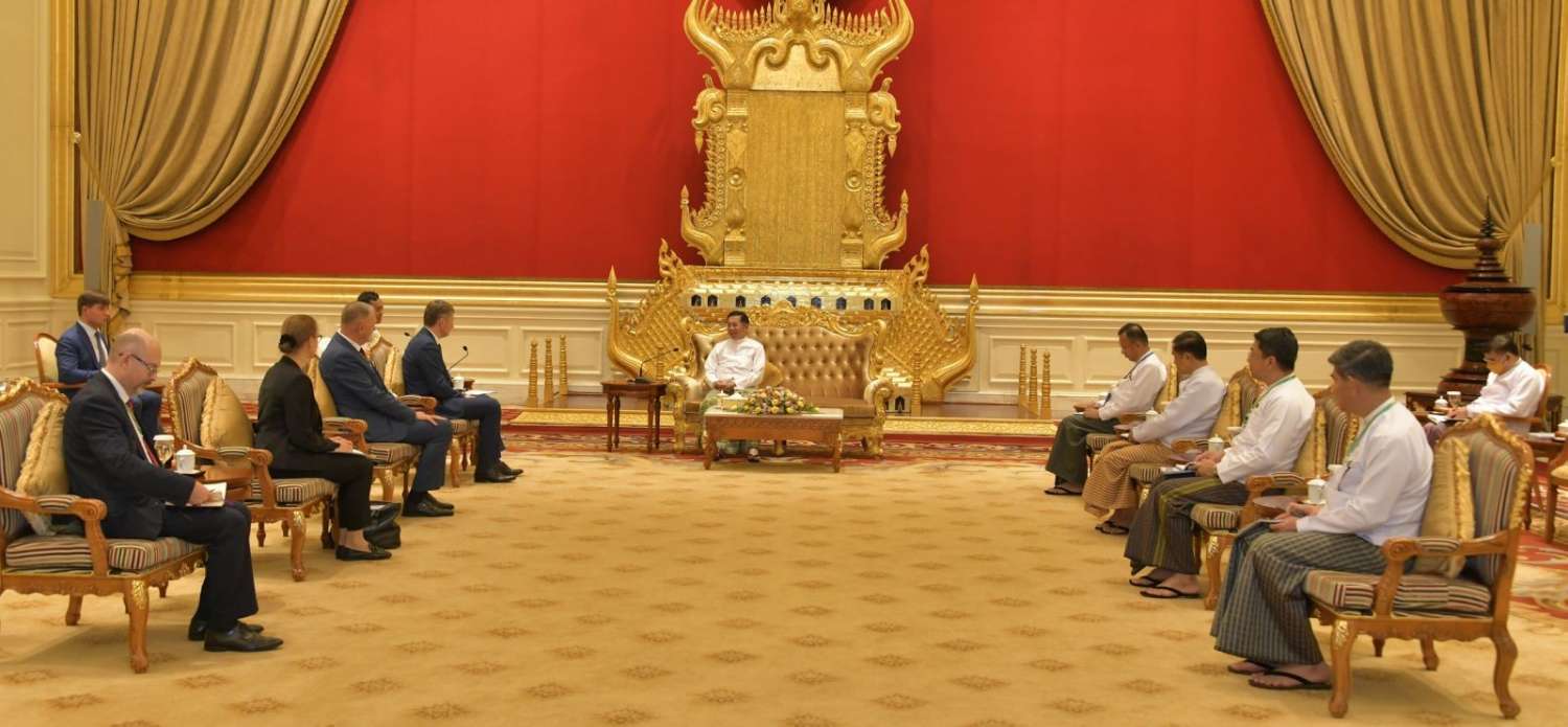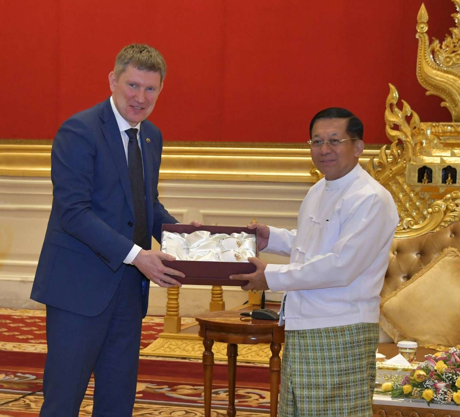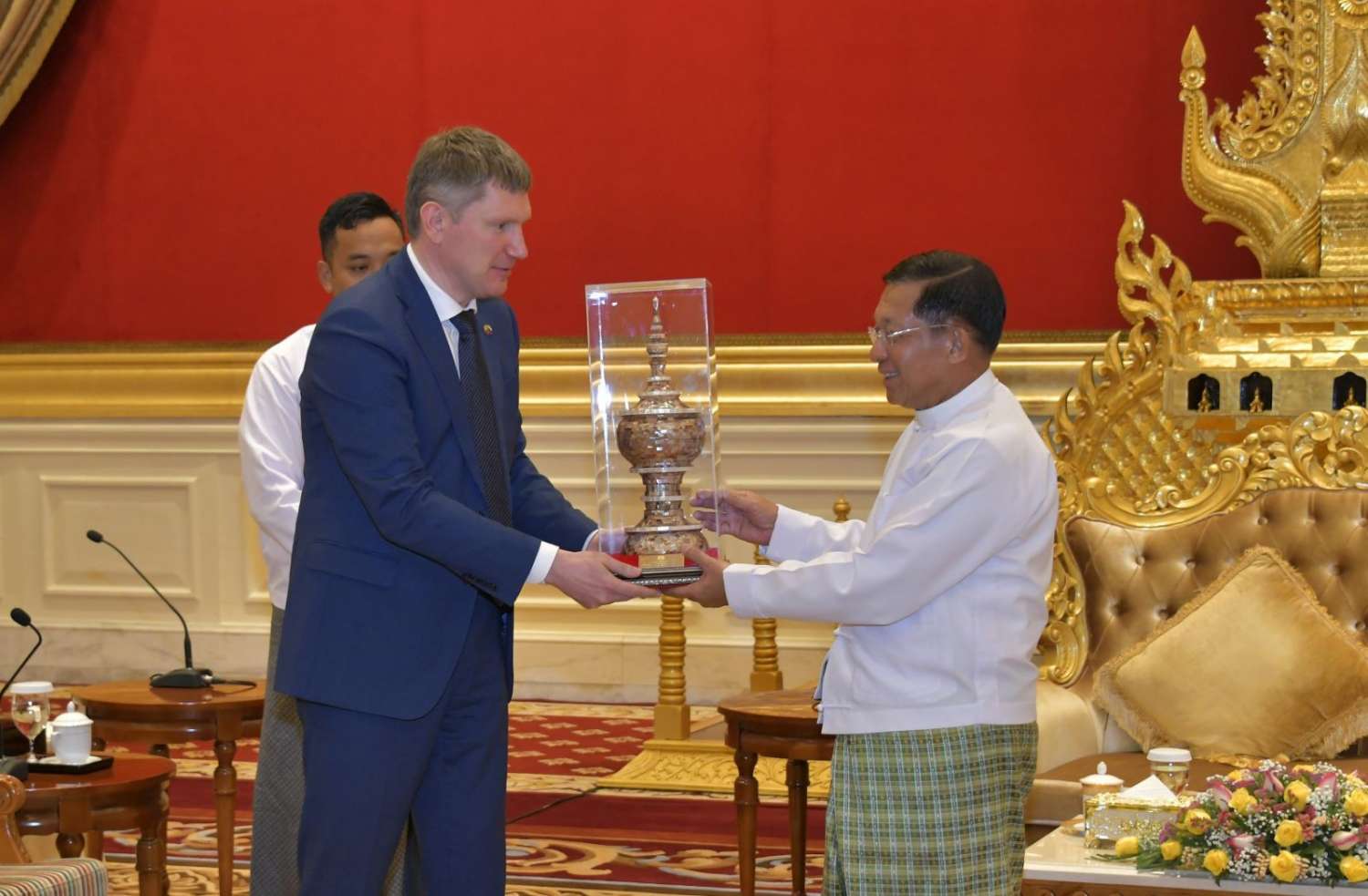 နိုင်ငံတော်စီမံအုပ်ချုပ်ရေးကောင်စီဥက္ကဋ္ဌ နိုင်ငံတော်ဝန်ကြီးချုပ် ဗိုလ်ချုပ်မှူးကြီး မင်းအောင်လှိုင်ထံ ရုရှားဖက်ဒရေးရှင်းနိုင်ငံ၊ စီးပွားရေးဖွံ့ဖြိုးတိုးတက်မှုဝန်ကြီးဌာနဝန်ကြီး H.E. Mr. Maxim RESHETNIKOV က ယနေ့နေ့လယ်ပိုင်းတွင် နေပြည်တော်ရှိ နိုင်ငံတော်စီမံအုပ်ချုပ်ရေးကောင်စီဥက္ကဋ္ဌရုံး သံတမန်ဆောင်ဧည့်ခန်းမ၌ လာရောက် ဂါရဝပြုတွေ့ဆုံသည်။