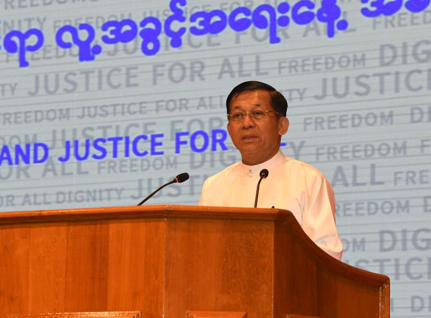 (၇၄) နှစ်မြောက် အပြည်ပြည်ဆိုင်ရာလူ့အခွင့်အရေးနေ့ အထိမ်းအမှတ်အခမ်းအနားကို ယနေ့နံနက်ပိုင်းတွင် နေပြည်တော်ရှိမြန်မာအပြည်ပြည်ဆိုင်ရာ ကွန်ဗင်းရှင်းဗဟိုဌာန-၁ ၌ ကျင်းပပြုလုပ်ရာ နိုင်ငံတော်စီမံအုပ်ချုပ်ရေးကောင်စီဥက္ကဋ္ဌ နိုင်ငံတော်ဝန်ကြီးချုပ် ဗိုလ်ချုပ်မှူးကြီး မင်းအောင်လှိုင် တက်ရောက်အမှာစကားပြောကြားသည်။