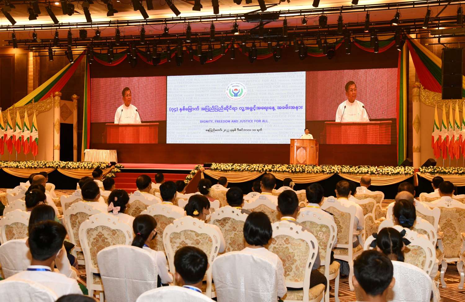 (၇၄) နှစ်မြောက်အပြည်ပြည်ဆိုင်ရာ လူ့အခွင့်အရေးနေ့ အထိမ်းအမှတ် အခမ်းအနားကျင်းပ နိုင်ငံတော်စီမံအုပ်ချုပ်ရေးကောင်စီဥက္ကဋ္ဌ နိုင်ငံတော်ဝန်ကြီးချုပ် ဗိုလ်ချုပ်မှူးကြီး မင်းအောင်လှိုင် တက်ရောက်အမှာစကားပြောကြား
