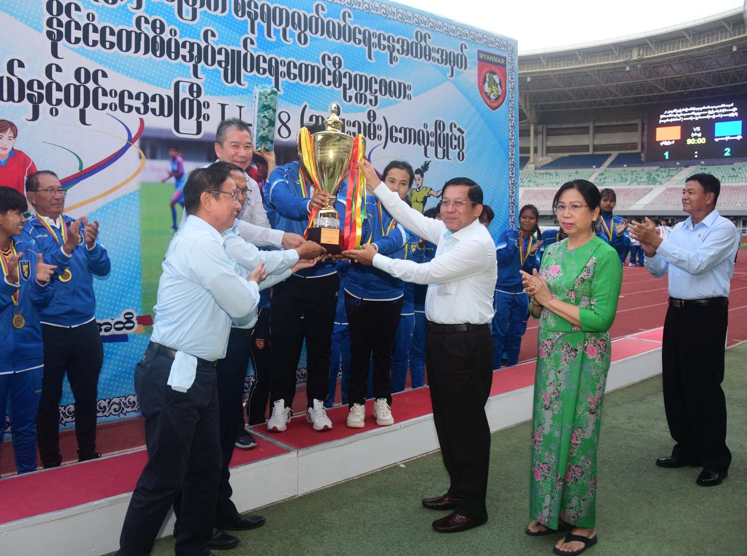 ၂၀၂၃ ခုနှစ် (၇၅)နှစ်မြောက် စိန်ရတုလွတ်လပ်ရေးနေ့အထိမ်းအမှတ် နိုင်ငံတော်စီမံအုပ်ချုပ်ရေးကောင်စီဥက္ကဋ္ဌဖလား ပြည်နယ်နှင့်တိုင်းဒေသကြီး (အလွတ်တန်းဖိတ်ခေါ်) အသက်(၁၈)နှစ်အောက် အမျိုးသမီးဘောလုံးပြိုင်ပွဲဗိုလ်လုပွဲနှင့် ဆုချီးမြှင့်ခြင်းအခမ်းအနားကို ယနေ့ညနေပိုင်းတွင်း နေပြည်တော်ရှိ ဝဏ္ဏသိဒ္ဓိဘောလုံးကွင်း၌ကျင်းပရာ နိုင်ငံတော်စီမံအုပ်ချုပ်ရေးကောင်စီဥက္ကဋ္ဌ နိုင်ငံတော်ဝန်ကြီးချုပ် ဗိုလ်ချုပ်မှူးကြီးမင်းအောင်လှိုင်နှင့် ဇနီးဒေါ်ကြူကြူလှတို့ တက်ရောက်ကြည့်ရှုအားပေးကြပြီး ဆုများပေးအပ်ချီးမြှင့်သည်။