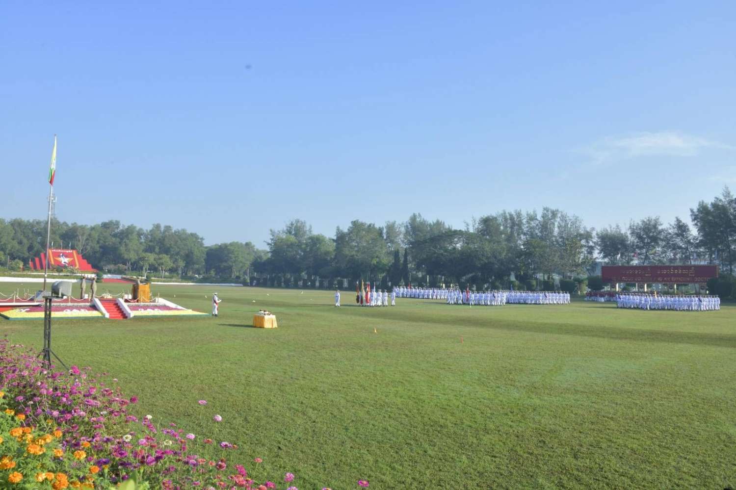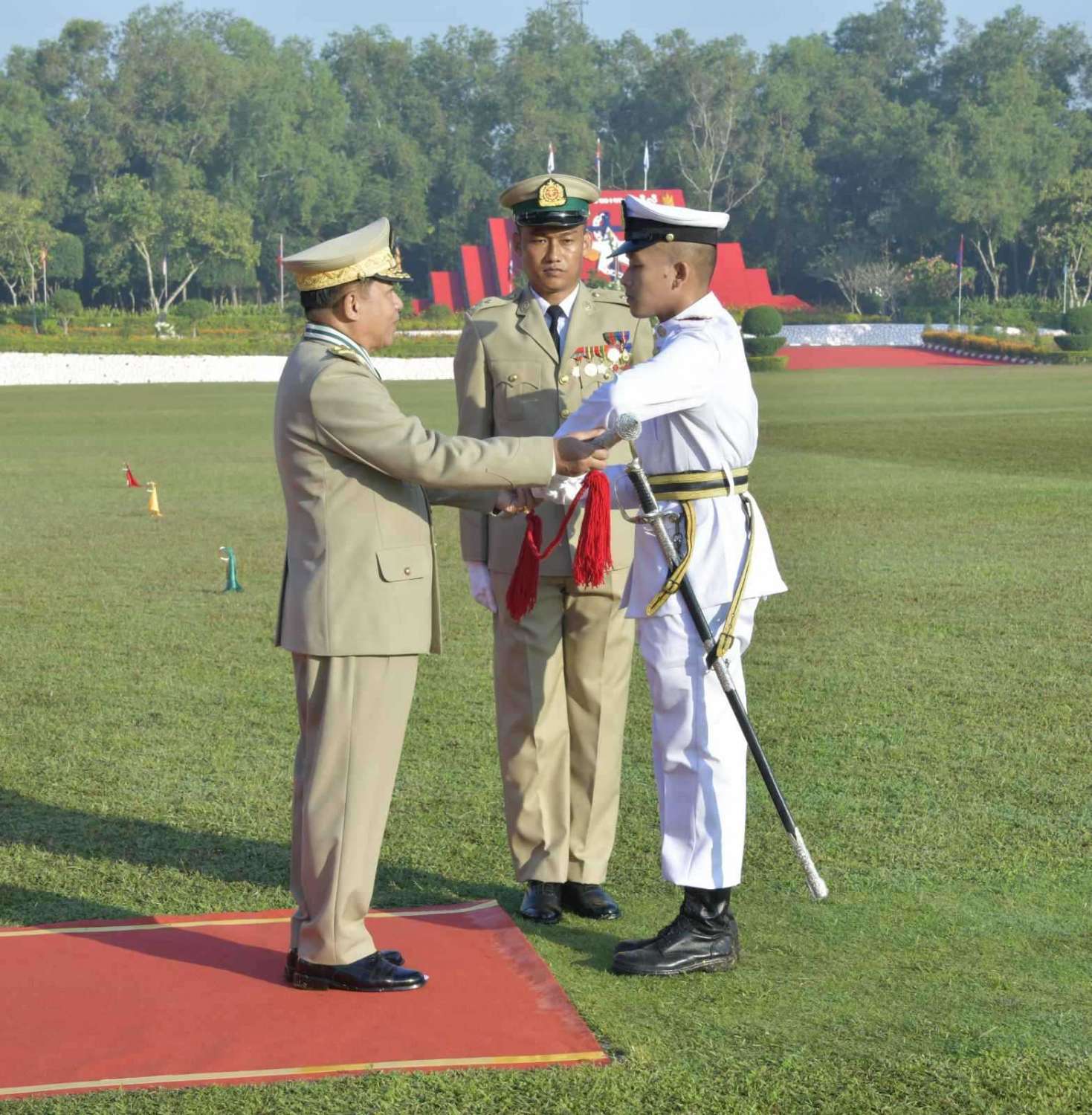 ယင်းနောက် နိုင်ငံတော်စီမံအုပ်ချုပ်ရေးကောင်စီဥက္ကဋ္ဌ တပ်မတော်ကာကွယ်ရေးဦးစီးချုပ် ဗိုလ်ချုပ်မှူးကြီး မဟာသရေစည်သူ မင်းအောင်လှိုင် သည် ဗိုလ်လောင်းတပ်ခွဲများ၏ အလေးပြုခြင်းကို ခံယူပြီး စစ်ရေးပြအခမ်းအနားမှ ပြန်လည်ထွက်ခွာသည်။