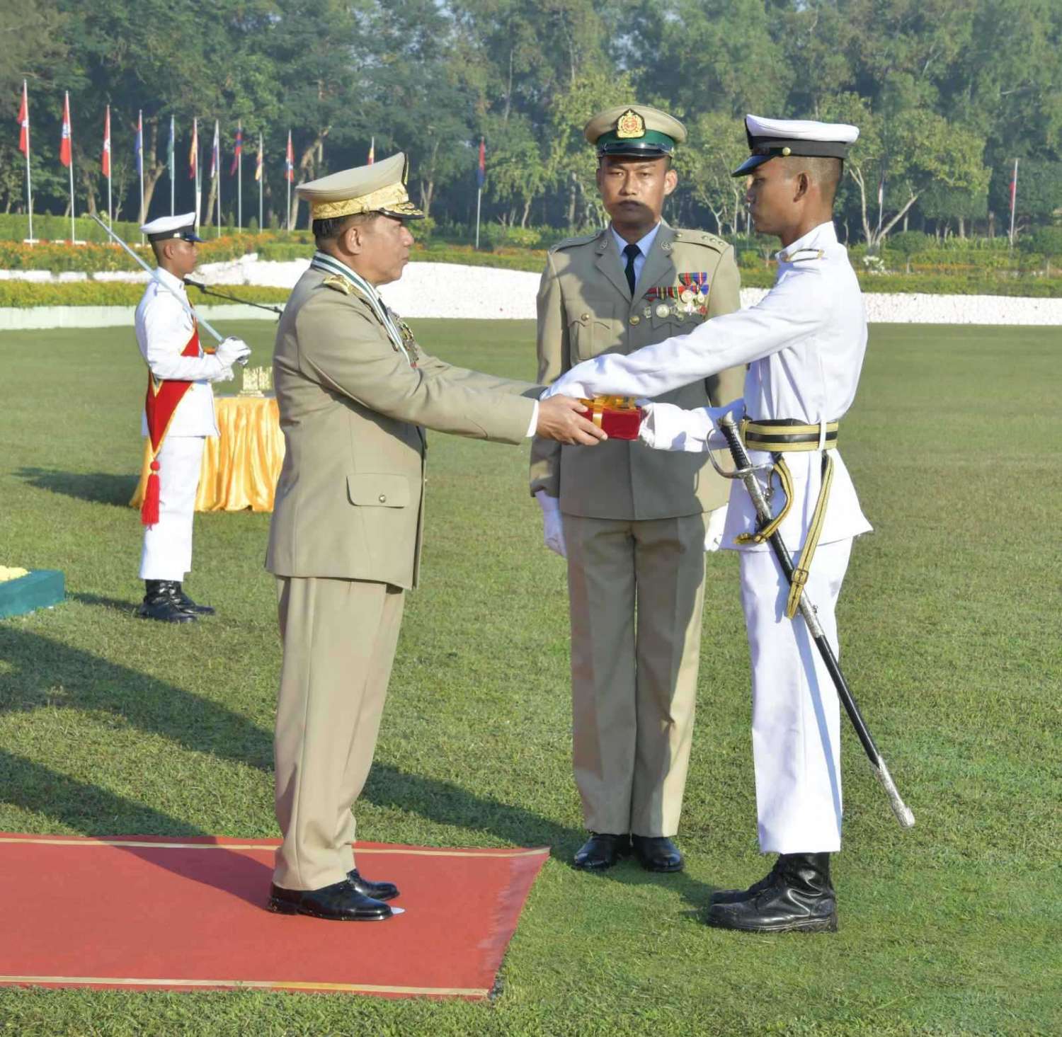 ယင်းနောက် နိုင်ငံတော်စီမံအုပ်ချုပ်ရေးကောင်စီဥက္ကဋ္ဌ တပ်မတော်ကာကွယ်ရေးဦးစီးချုပ် ဗိုလ်ချုပ်မှူးကြီး မဟာသရေစည်သူ မင်းအောင်လှိုင် က တပ်မတော်ဆေးတက္ကသိုလ် ဗိုလ်လောင်းသင်တန်း အမှတ်စဉ် (၂၃)မှ အောင်စစ်သည်ဆုရရှိသူ ဗိုလ်လောင်း ဟိန်းထွန်းဇော်၊ လေ့ကျင့်ရေးထူးချွန်ဆုရရှိသူ ဗိုလ်လောင်း မင်းခန့်ကျော်နှင့် စာပေထူးချွန်ဆုရရှိသူ ဗိုလ်လောင်း ကျော်သူရတို့အား ဆုများအသီးသီး ပေးအပ်ချီးမြှင့်သည်။