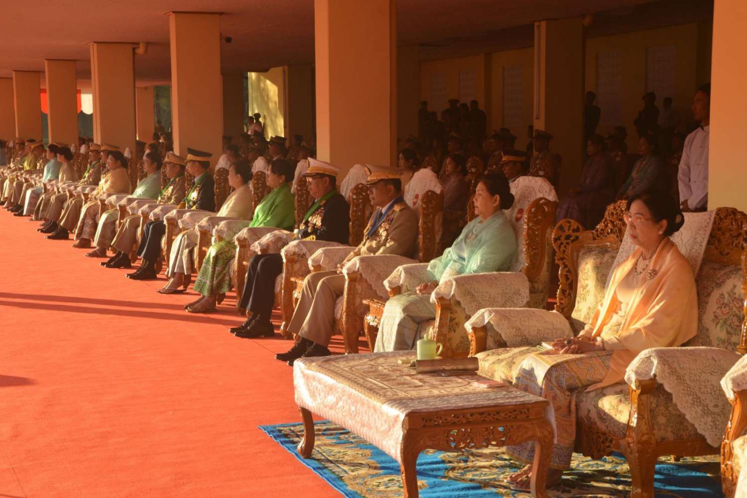 အဆိုပါ အခမ်းအနားသို့ နိုင်ငံတော်စီမံအုပ်ချုပ်ရေးကောင်စီဥက္ကဋ္ဌ တပ်မတော် ကာကွယ်ရေးဦးစီးချုပ်နှင့်အတူ ဇနီး ဒေါ်ကြူကြူလှ၊ ညှိနှိုင်းကွပ်ကဲရေးမှူး (ကြည်း၊ ရေ၊ လေ) ဗိုလ်ချုပ်ကြီး သီရိပျံချီ မောင်မောင်အေးနှင့်ဇနီး၊ ကာကွယ်ရေးဦးစီးချုပ်(ရေ) ဗိုလ်ချုပ်ကြီး ဇေယျကျော်ထင် မိုးအောင်နှင့်ဇနီး၊ ကာကွယ်ရေးဦးစီးချုပ်(လေ) ဗိုလ်ချုပ်ကြီး ဇေယျကျော်ထင်ထွန်းအောင်နှင့်ဇနီး၊ ကာကွယ်ရေးဦးစီးချုပ်ရုံးမှ တပ်မတော်အရာရှိကြီးများနှင့် ဇနီးများ၊ ပြည်ထောင်စုဝန်ကြီးများ၊ ရန်ကုန်တိုင်းဒေသကြီးဝန်ကြီးချုပ်၊ ရန်ကုန်တိုင်းစစ်ဌာနချုပ် တိုင်းမှူး၊ ရန်ကုန်မြို့တော်ဝန်၊ တပ်မတော်ဆေးတက္ကသိုလ် ကျောင်းအုပ်ကြီးနှင့် မင်္ဂလာဒုံတပ်နယ်မှ တာဝန်ရှိသူများ၊ ကျောင်းဆင်းဗိုလ်လောင်းများ၏ မိဘအုပ်ထိန်းသူများဖြစ်သည့် တပ်မတော်ဆေးတက္ကသိုလ်၊ စာပေဌာနနှင့် လေ့ကျင့်ရေးဌာနတို့မှ နည်းပြအရာရှိများနှင့် ဆရာ၊ ဆရာမများ၊ ဖိတ်ကြားထားသည့် ဧည့်သည့်တော်များ တက်ရောက်ကြသည်။
