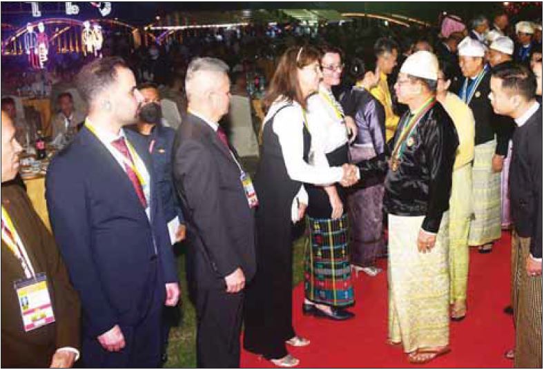 ထို့နောက် နိုင်ငံတော်စီမံအုပ်ချုပ်ရေးကောင်စီဥက္ကဋ္ဌ နိုင်ငံတော်ဝန်ကြီးချုပ် ဗိုလ်ချုပ်မှူးကြီး သတိုးမဟာသရေစည်သူ သတိုးသီရိသုဓမ္မ မင်းအောင်လှိုင်နှင့်ဇနီး ဒေါ်ကြူကြူလှတို့သည် ညစာစားပွဲအခမ်းအနား ကျင်းပရာနေရာသို့ ရောက်ရှိကြပြီး နိုင်ငံတော်စီမံအုပ်ချုပ်ရေးကောင်စီ ဒုတိယဥက္ကဋ္ဌ ဒုတိယဝန်ကြီးချုပ်နှင့် ဇနီးတို့နှင့်အတူ နိုင်ငံရေးပါတီများမှ ဥက္ကဋ္ဌများနှင့် ကိုယ်စားလှယ်များ၊ နိုင်ငံခြားသံရုံးများမှ သံအမတ်ကြီးများနှင့် သံရုံးတာဝန်ခံများ၊ ဂုဏ်ထူးဆောင် ကောင်စစ်ဝန်များနှင့် အထူးဖိတ်ကြားထားသည့် ဧည့်သည်တော်များကို ရင်းရင်းနှီးနှီး နှုတ်ဆက်သည်။