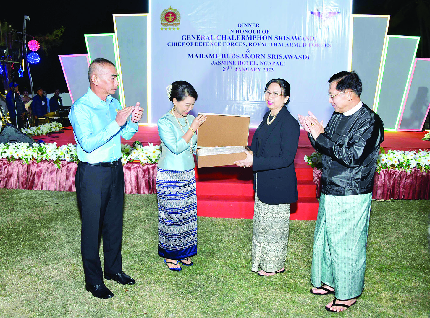မြန်မာနိုင်ငံ၌ အိမ်ရှင်အဖြစ်လက်ခံကျင်းပပြုလုပ်ခဲ့သည့် (၈)ကြိမ်မြောက် မြန်မာ-ထိုင်း တပ်မတော်နှစ်ရပ်အကြား အဆင့်မြင့်အရာရှိကြီးများအစည်းအဝေး 8th High Level Committee Meeting သို့ တက်ရောက်ခဲ့သည့် ထိုင်းဘုရင့်တပ်မတော်ကာကွယ်ရေးဦးစီးချုပ် General Chalermphon Srisawasdi နှင့် ဇနီး Madame Budsakorn Srisawasdi ဦးဆောင်သည့် ကိုယ်စားလှယ်အဖွဲ့အား နိုင်ငံတော်စီမံအုပ်ချုပ်ရေးကောင်စီဥက္ကဋ္ဌ တပ်မတော်ကာကွယ်ရေးဦးစီးချုပ် ဗိုလ်ချုပ်မှူးကြီး မင်းအောင်လှိုင်နှင့် ဇနီး ဒေါ်ကြူကြူလှတို့က ယနေ့ညပိုင်းတွင် ရခိုင်ပြည်နယ်၊ သံတွဲမြို့၊ ငပလီကမ်းခြေရှိ Jasmine Ngapali Resort ၌ ဂုဏ်ပြုညစာဖြင့် တည်ခင်းဧည့်ခံသည်။