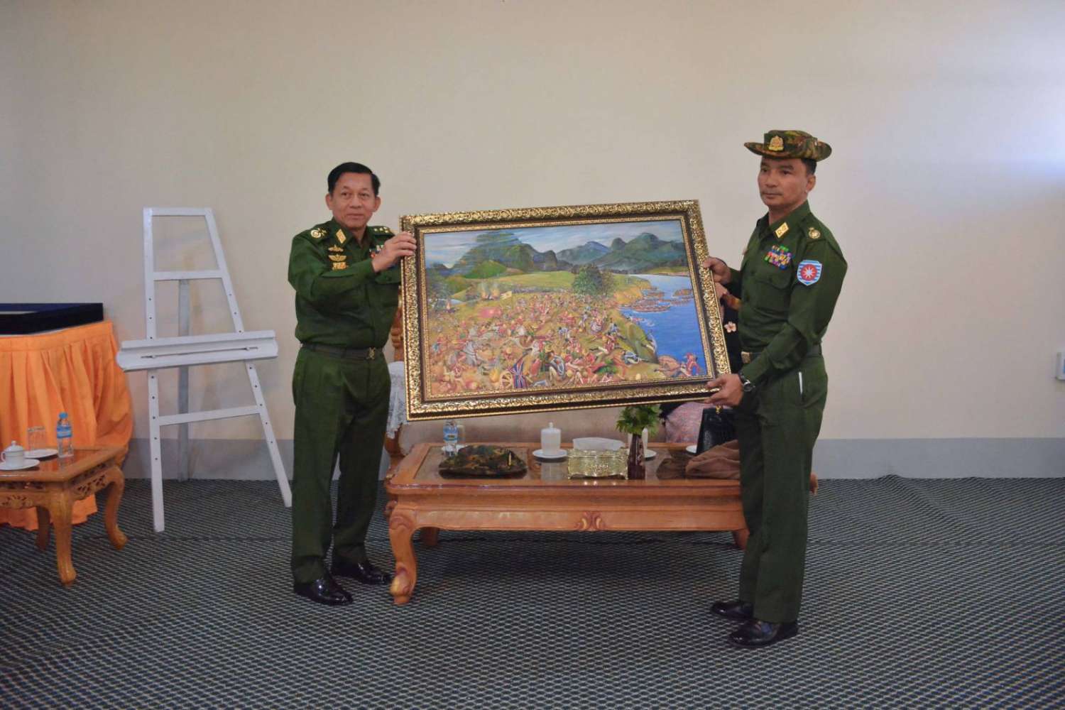 ယင်းနောက် နိုင်ငံတော်စီမံအုပ်ချုပ်ရေးကောင်စီဥက္ကဋ္ဌ တပ်မတော်ကာကွယ်ရေးဦးစီးချုပ်က အင်္ဂလိပ်-မြန်မာ ပထမစစ်ပွဲကာလအတွင်း ၁၈၂၄ ခုနှစ်၊ မေလ ၁၇ ရက်တွင် ရခိုင်စစ်မျက်နှာ၌ စစ်သူကြီး မဟာဗန္ဓုလ ကွပ်ကဲမှုအောက်ရှိ မဟာသီဟသူရ (မြဝတီမင်းကြီး ဦးစ) ဦးစီးသော မြန်မာဘုရင့်တပ်များသည် ပန်းဝါမြစ်ကိုဖြတ်ကူး၍ ထိုမြစ်အနီးရှိ ရေကန်ဘေးတွင် အခိုင်အမာခြေကုပ်ယူစခန်းချနေသည့် ဗြိတိသျှတပ်ဖွဲ့များအား ပြင်းပြင်းထန်ထန် ချေမှုန်းတိုက်ခိုက်နေပုံကို သရုပ်ဖော်ရေးဆွဲထားသည့် ဆီဆေးပန်းချီကားအား အနောက်ပိုင်းတိုင်းစစ်ဌာနချုပ်တိုင်းမှူးကို ပေးအပ်ခဲ့ကြောင်း သတင်းရရှိသည်။